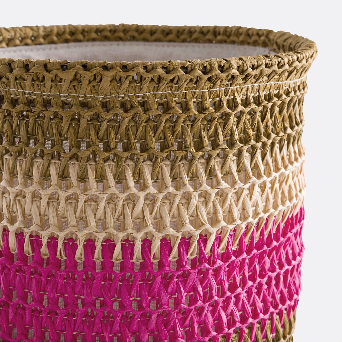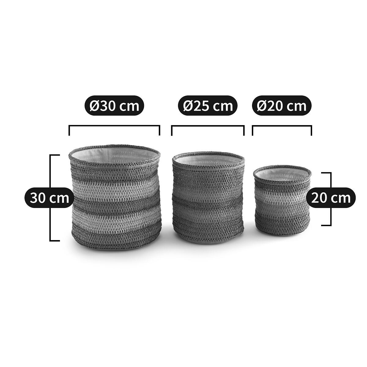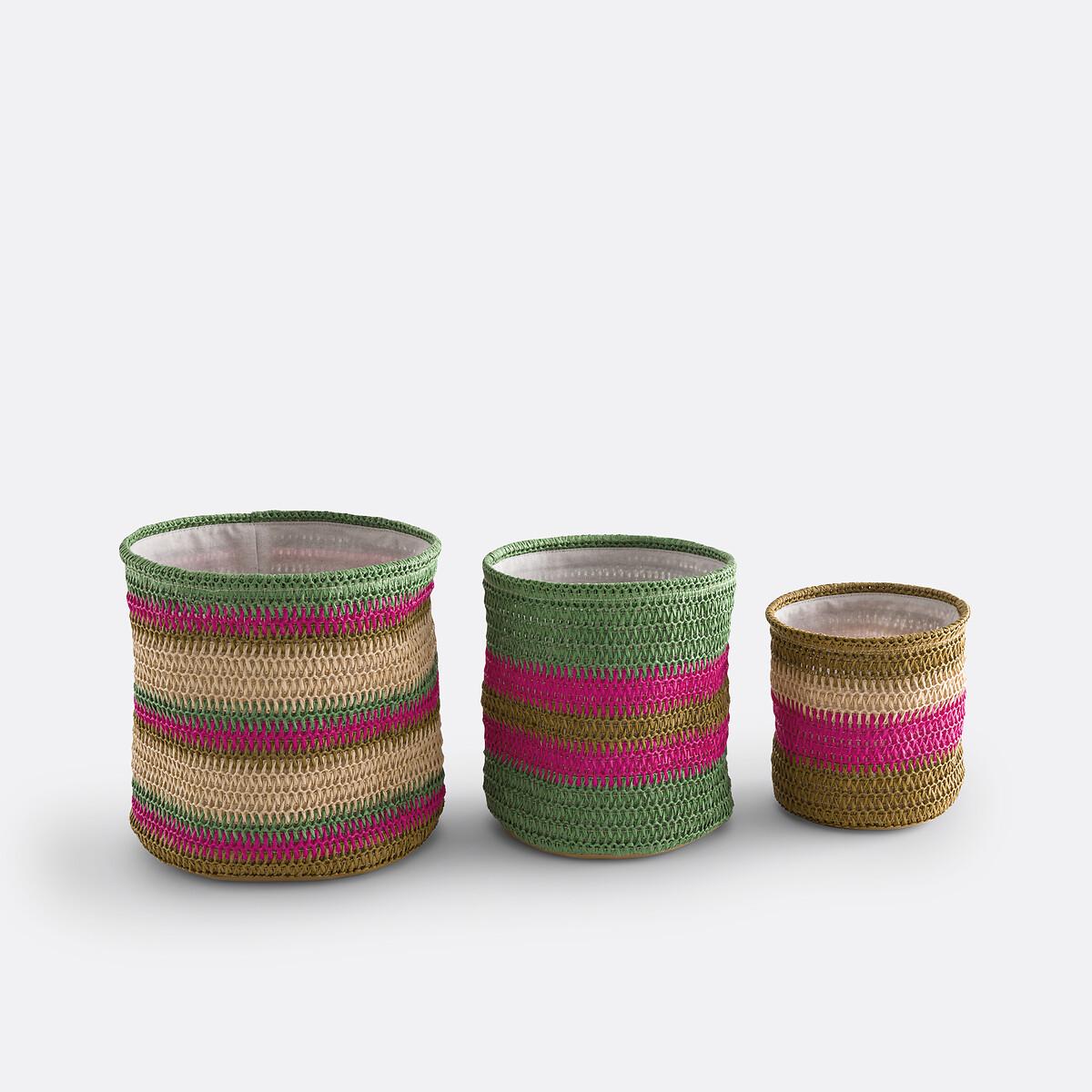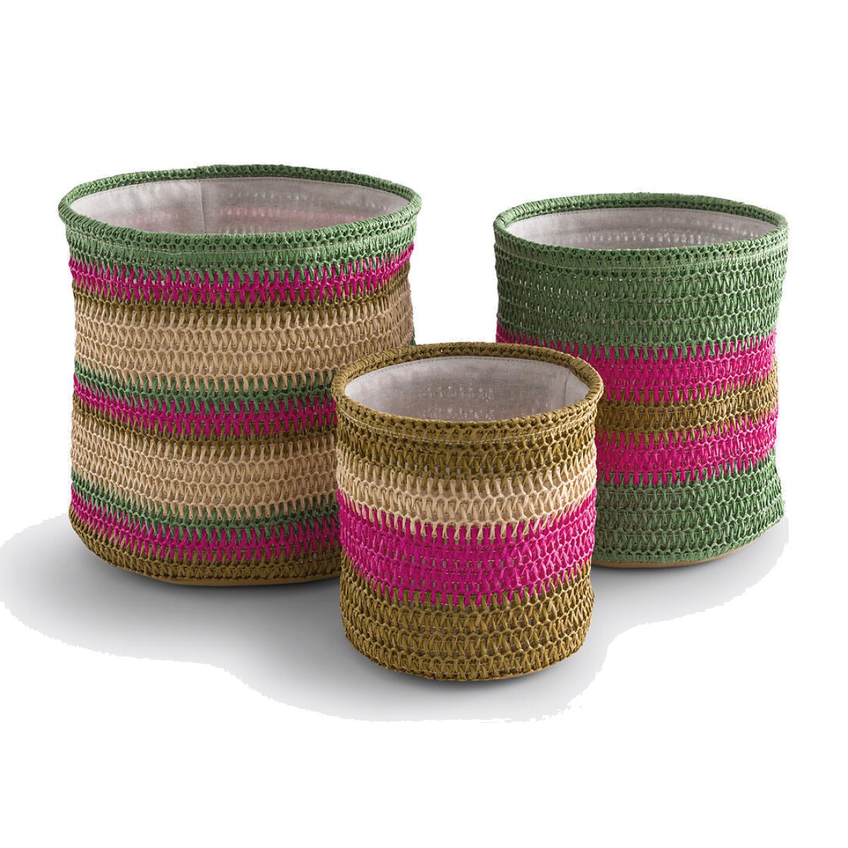 “A place for everything, and everything in its place”. These three crocheted paper baskets are useful in every room of the house: to store keys in the hall, makeup in the bathroom, toys in the bedroom... The little decorative touch to beautify everyday life. Product Details • In crocheted paper, with multi-coloured stripes • Polyester lining • Iron structure • Set of 3 different sizesDimensions. Size 1 • Diameter: 20cm • Height: 20cm. Size 2 • Diameter: 25cm • Height: 26.5cm. Size 3 • Diameter 30cm • Height: 30cm