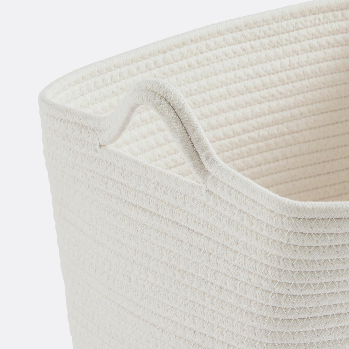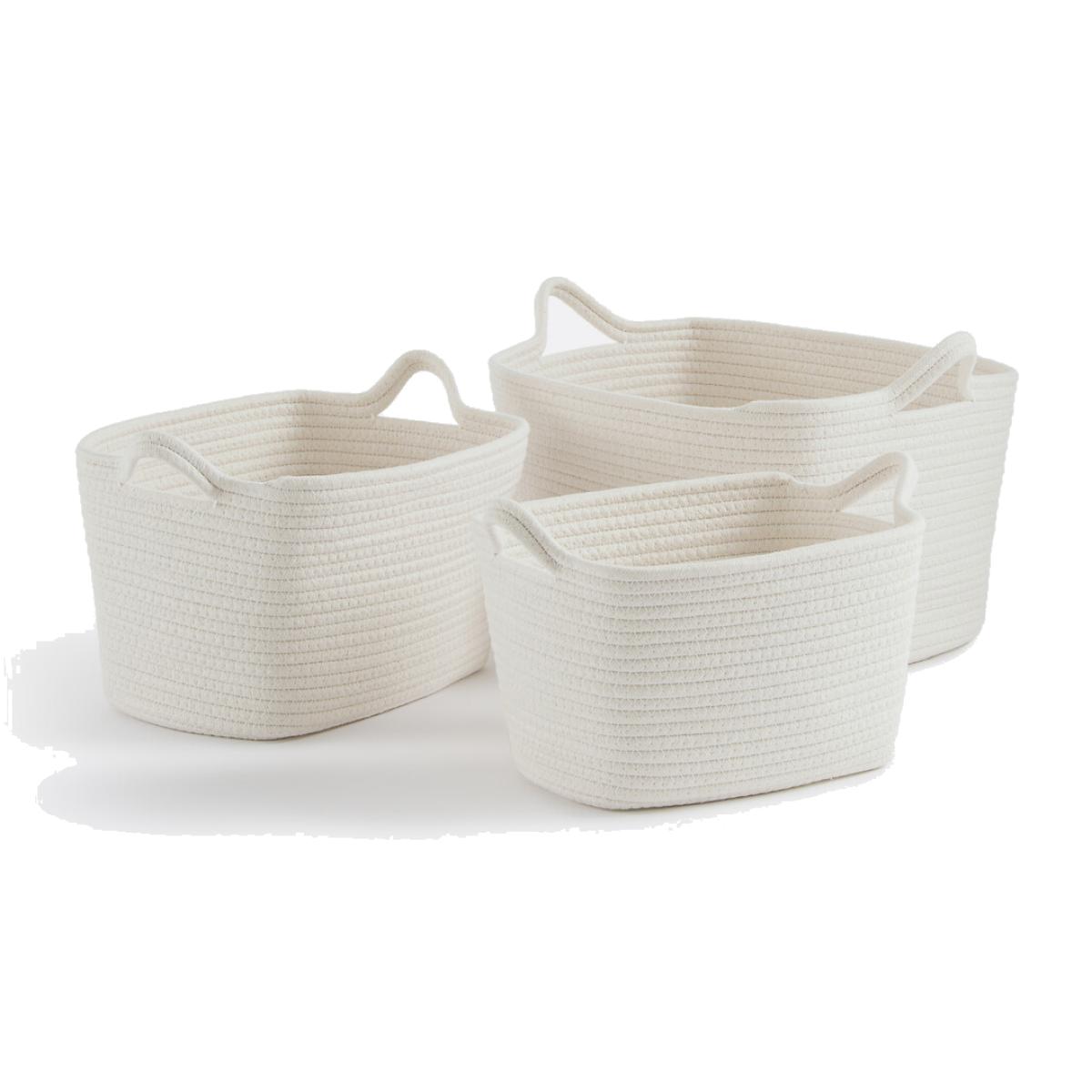 To store everything in every room. These versatile Kesia baskets can be used as laundry baskets, toy bins or cosmetics storage. Their timeless style makes them both attractive and functional. Product Details • 100% cotton • Rectangular shape • 2 handles • Sold in packs of 3Dimensions Size 1 • Width: 26cm • Height: 22cm • Length: 38cm. Size 2 • Width: 22cm • Height: 20cm • Length: 33cm. Size 3 • Width: 20cm • Height: 18cm • Length: 28cm