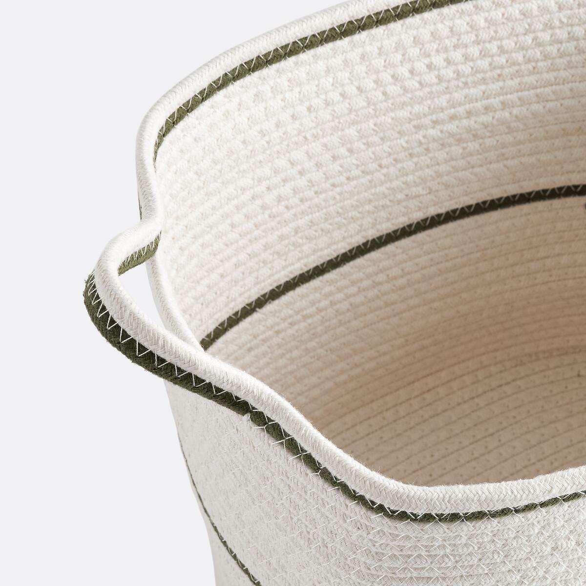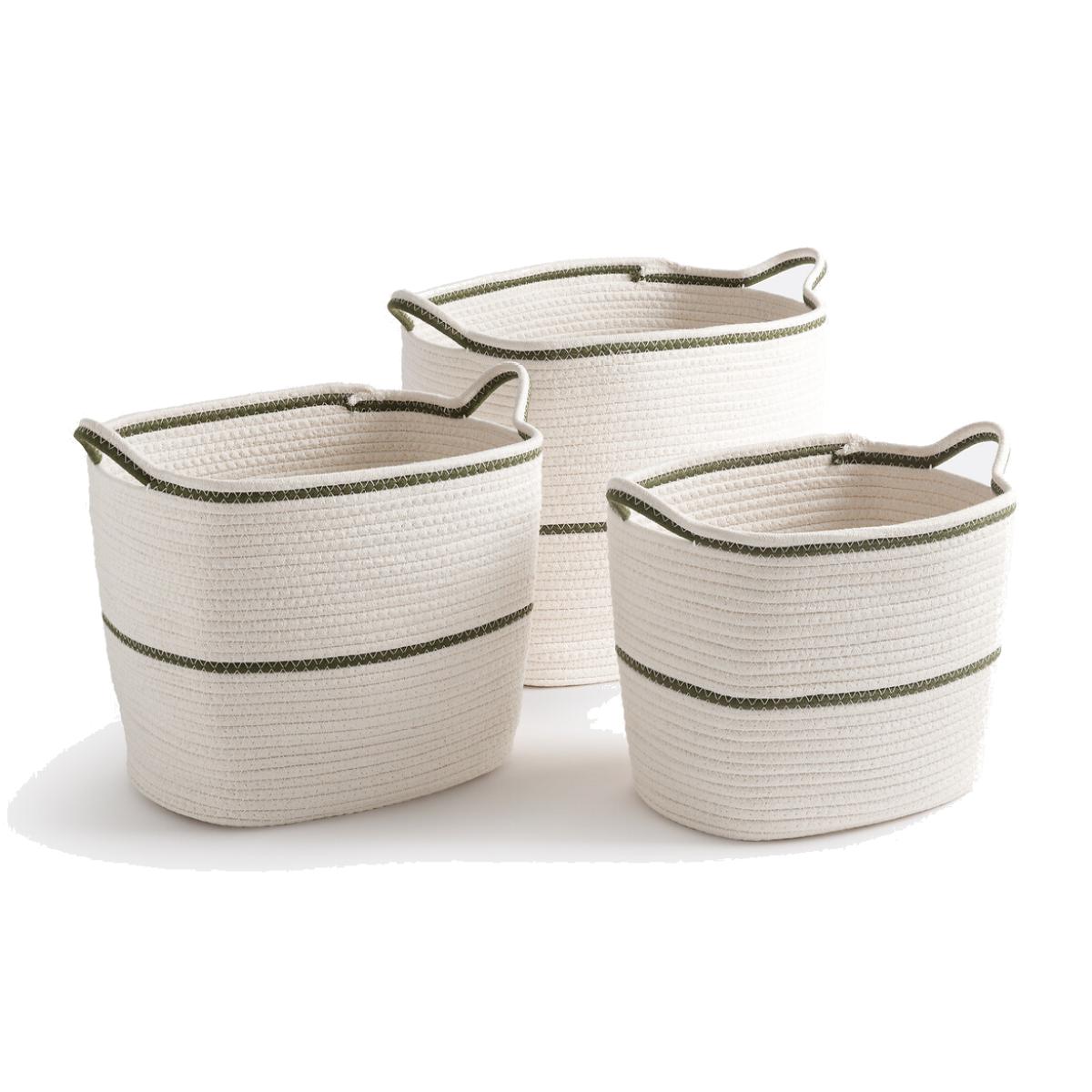 Versatile, attractive and functional, Kesia baskets have a timeless style. Practical, they can be used as both a laundry basket and a toy bin, and can be stacked to save space. To keep everything tidy in any room. Product Details • 100% cotton • Green coloured edging • Rectangular shape • 2 handles • Sold in packs of 3Dimensions Size 1 • Width: 27cm • Height: 33cm • Length: 37cm. Size 2 • Width: 23cm • Height: 29cm • Length: 33cm. Size 3 • Width: 20cm • Height: 26cm • Length: 30cm