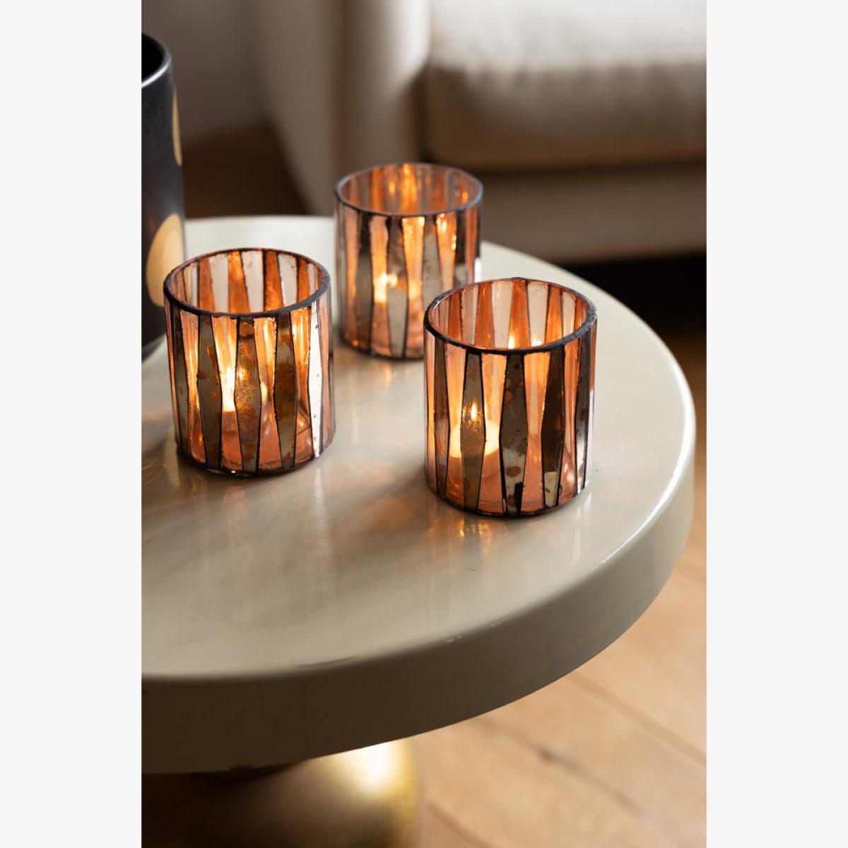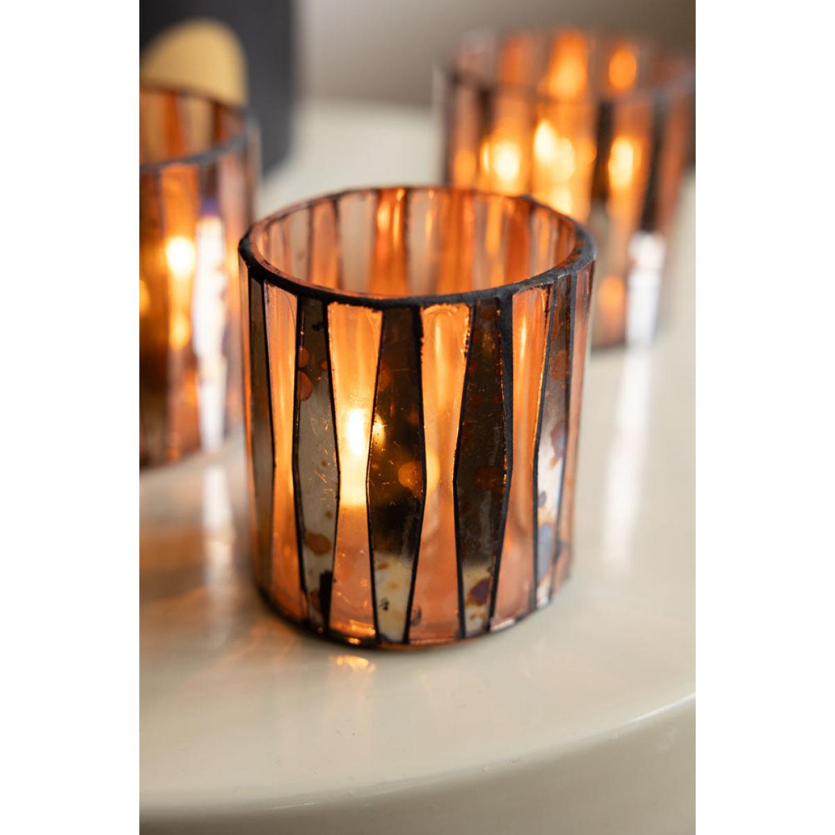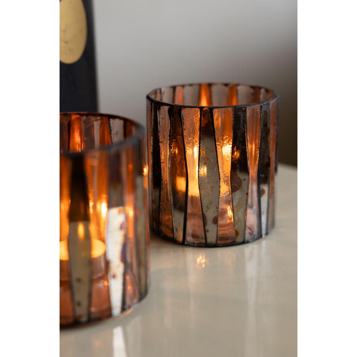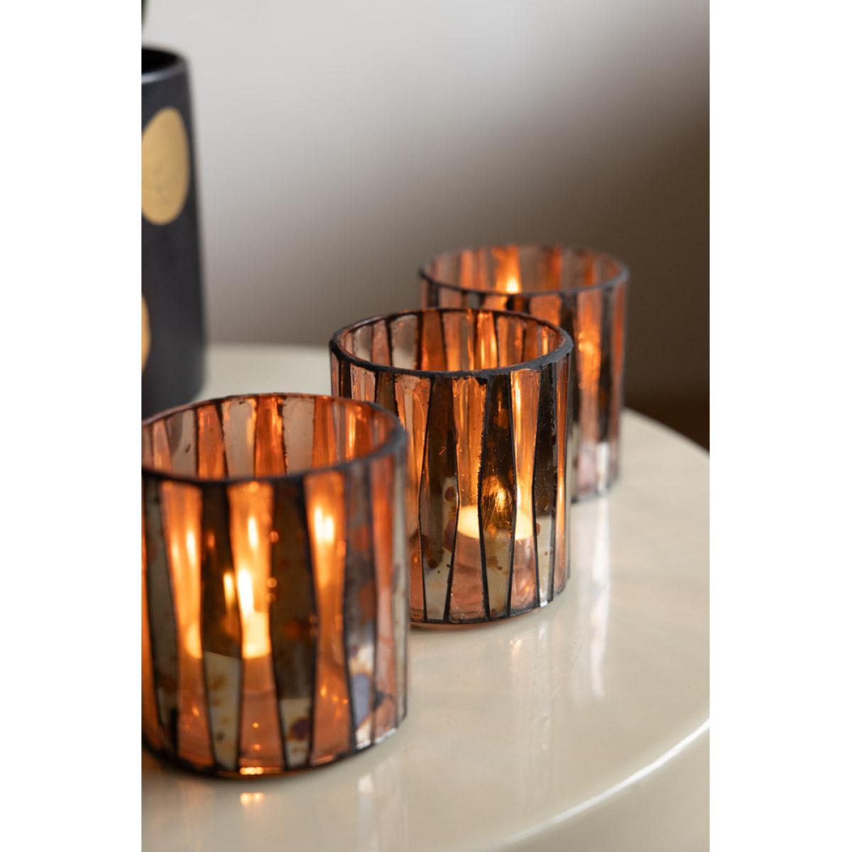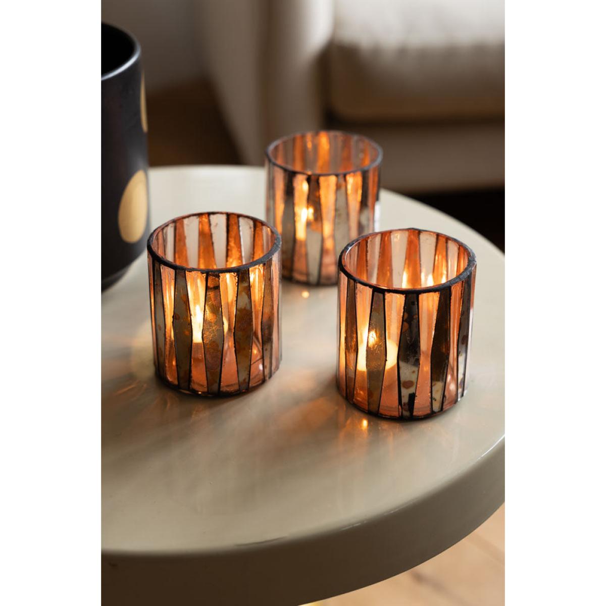 <!--td --> Feeling a lack of cosy? Our Set of 3 Metallic Mosaic Effect Glass Tealight Holders is here to save the day. Featuring a unique mosaic stripe pattern in brown and terracotta hues, sprinkled with an eye-catching blue and brown “burnt” effect, adding a touch of rustic charm. The splotchy, oil-like pattern makes each of these candle holders one-of-a-kind, radiating a beautifully earthy vibe. Perfect for creating a laid-back ambience, these tealight candle holders showcase brown-tinted glass which casts a gorgeous, soft glow when tealights are lit. Whether unwinding after a long day or setting the tone for a relaxed evening, these candle holders are the perfect blend of rustic and chic for your tealight candles. Enhance any room with the magical hue of these candle holders, we promise that they’ll quickly become your favourite little flickering companions. - Set Of 3 Metallic Mosaic Effect Glass Tealight Holders - Measures: H9cm x L8cm x W8cm - Material: Glass - Clean with a dry cloth