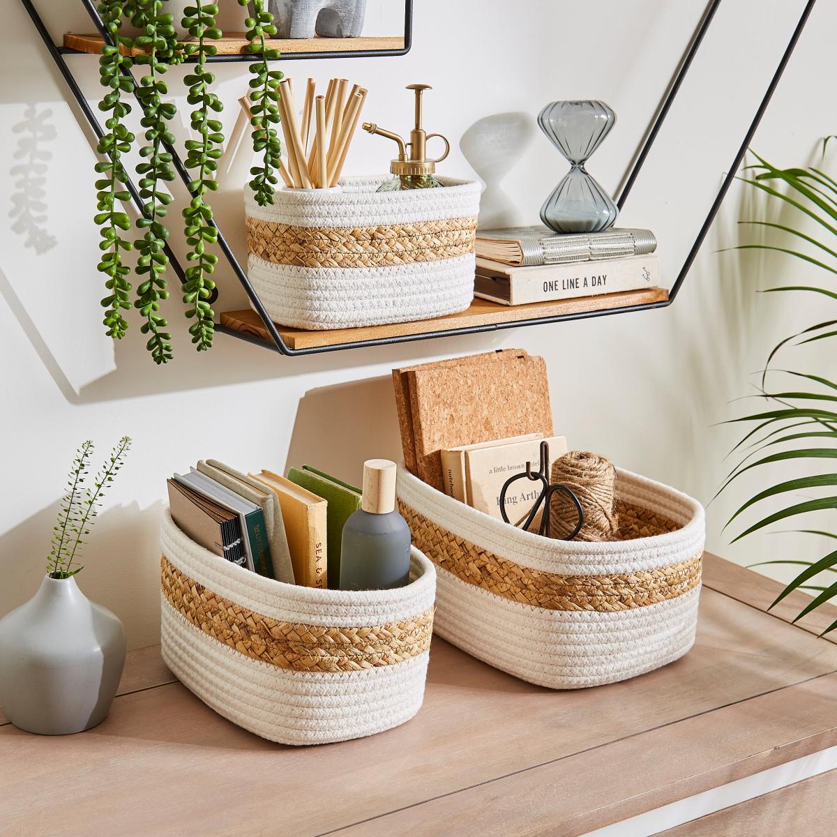 * 3 x Storage Baskets* Small in Size* Stylish Design* Features Natural Water Hyacinth Discover the versatile elegance of the Set of 3 Mixed Material Storage Baskets, a collection designed to enhance your organisation whilst adding a touch of sophistication to your space. With its stylish design and practical features, this set is tailored for small spaces and perfectly suited for storing small accessories and ornaments. Unveiling a trio of baskets, this set offers a comprehensive solution for your storage need: each basket is thoughtfully crafted with a blend of materials, including natural water hyacinth, creating a harmonious blend of functionality and aesthetics. Perfectly suited for small spaces, these baskets optimise storage in tight quarters: from delicate accessories to cherished ornaments, they provide a suitable home for all your precious trinkets. Why wait? Get yours now!