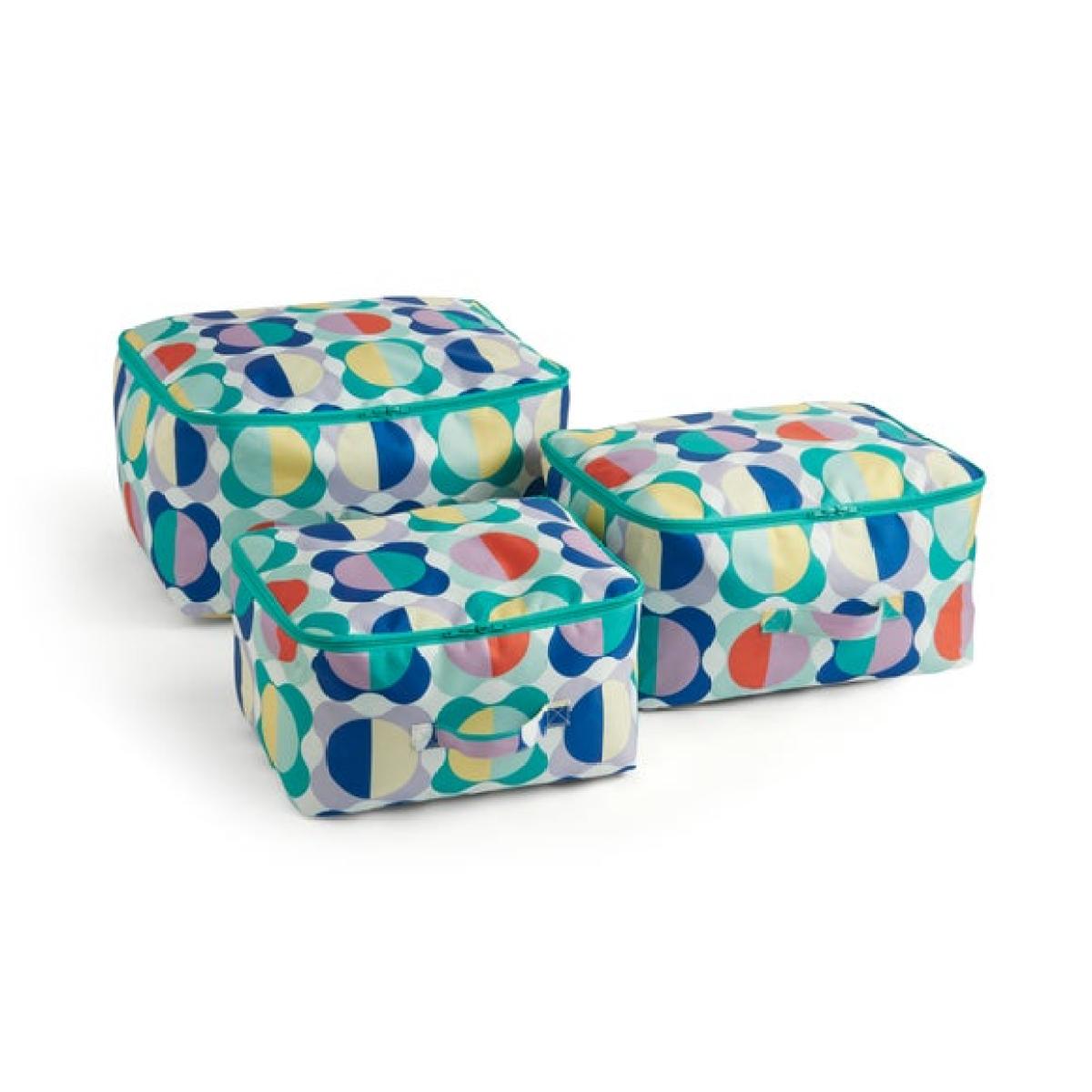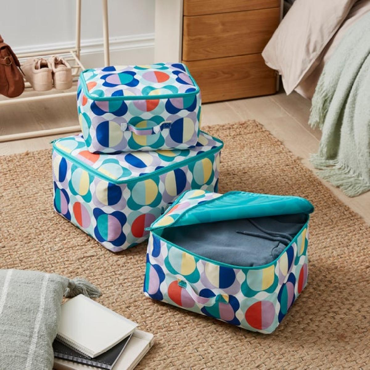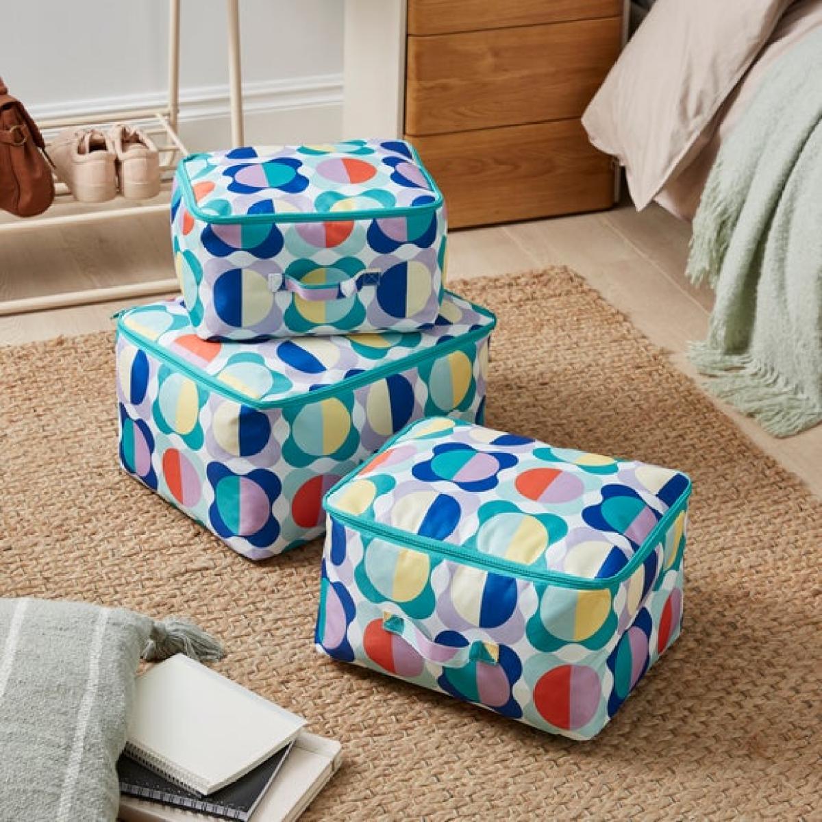 I love this set of three bright storage bags for their playful yet practical design. They work brilliantly in contemporary and eclectic interiors, adding a pop of colour and organisation without fuss. The bold geometric pattern makes them ideal for bedrooms, living rooms, or even kid’s spaces where they can double as storage and decorative accents. Practical styling tips include grouping them on open shelving or inside wardrobes for easy access, or using them in a laundry or craft area to keep clutter tidy. Their versatile size means they can hold everything from clothes to toys, and the bright pattern helps hide the occasional spill or dirt - making them both functional and fun.