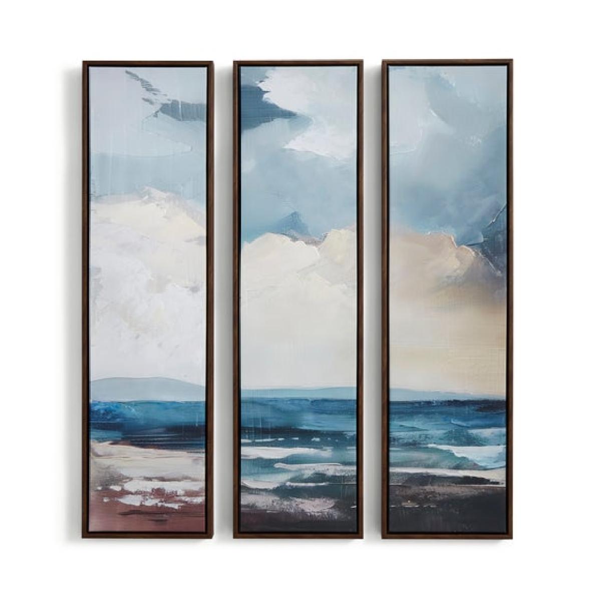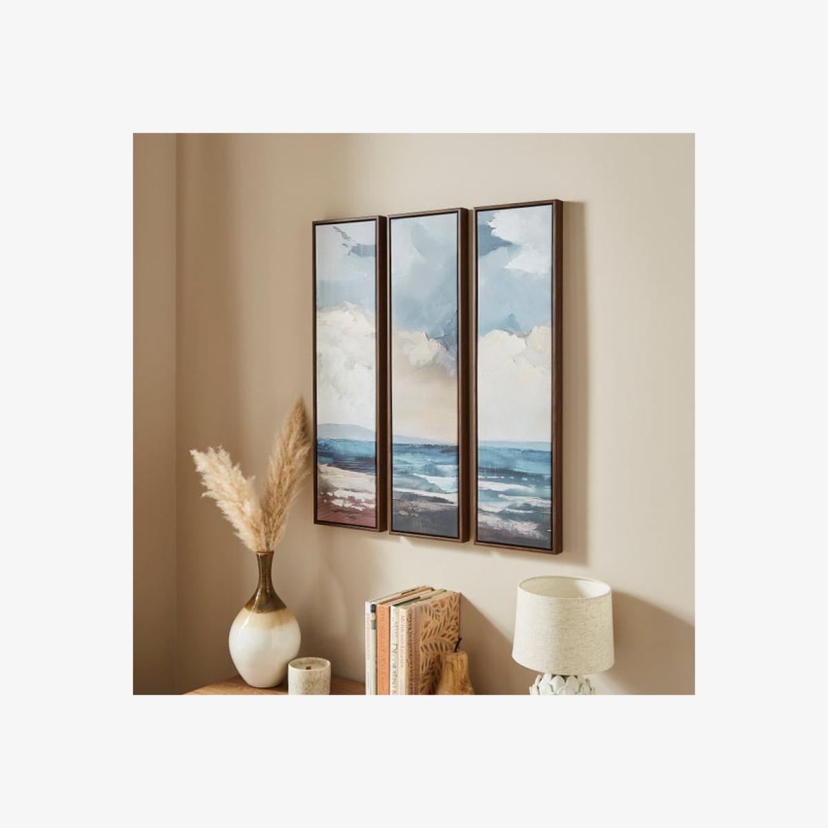 * Hand-painted finish * Ocean design * Framed canvases * Set of 3 Bring the calming feel of the sea into your space with the Set of 3 Ocean View Framed Canvases. With hand-painted ocean designs, these prints capture the gentle movement of the waves and the soft hues of the coast. Ideal for creating a tranquil atmosphere, each piece is framed and ready to hang, making it a simple way to update your decor.