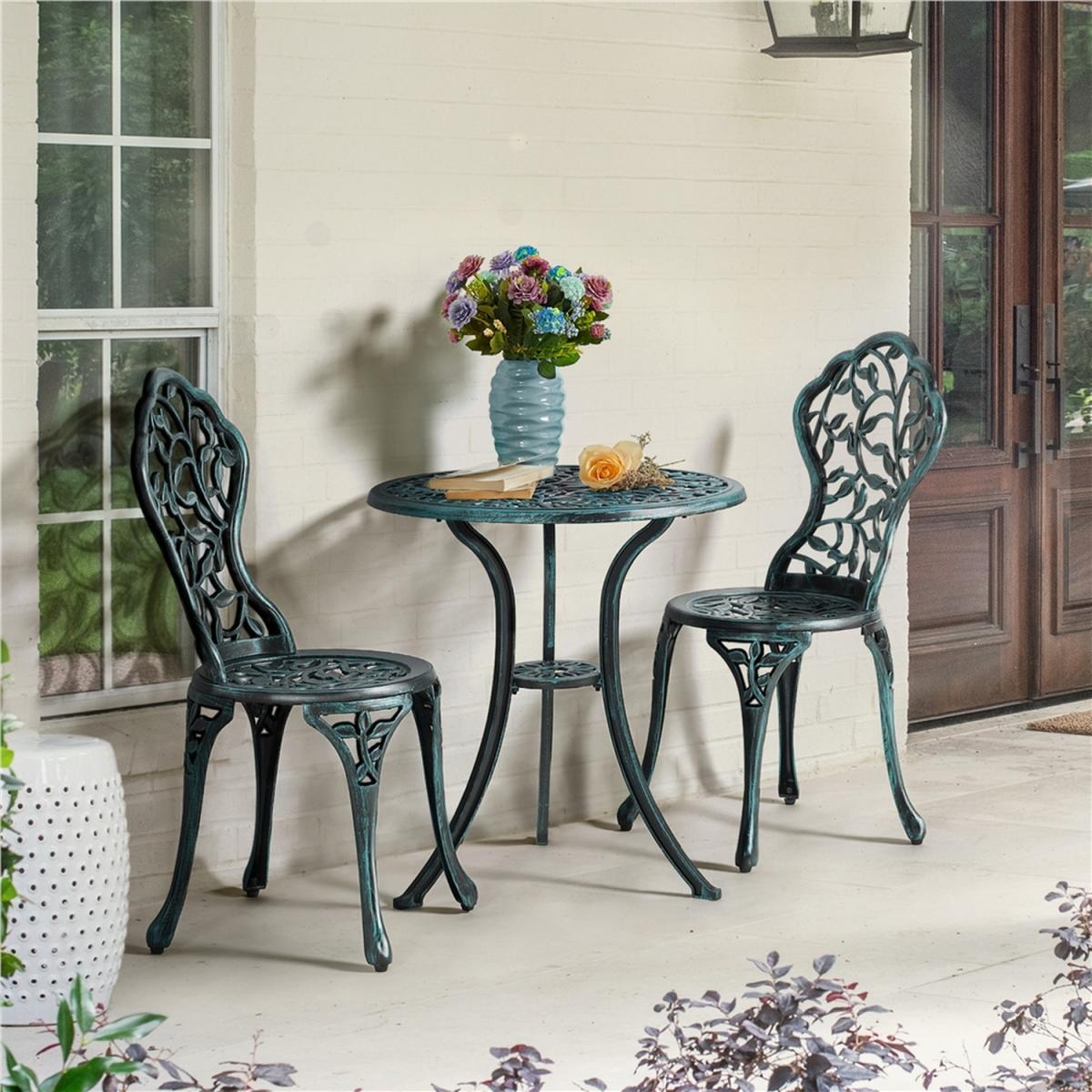 Our elegant patio bistro table set is suitable for most outdoor settings or events. Natural Vintage design with floral-petal-shaped back more antique charm to your designated place Sturdy aluminium ensures this patio bistro table set is sturdy and durable Oxidation-resistant and water-proof coating does not fade easily Armlesschairs serve more space for free movement Adjustable foot pads help adjust and control the balance of chair according to different patio situation Our outdoor dining table set can be placed in most outdoor events such as an outdoor wedding ceremony, patio setting for cafe and so on.