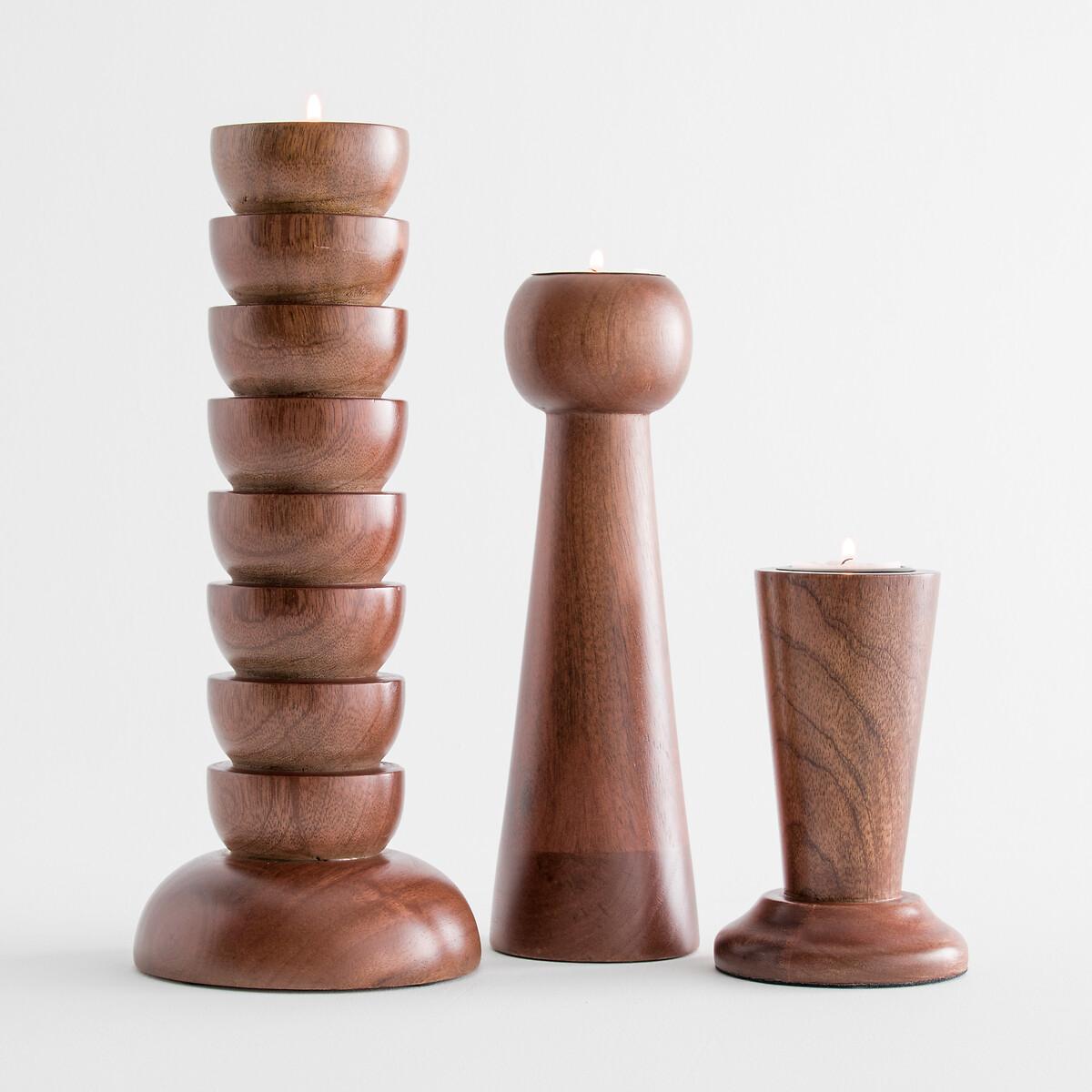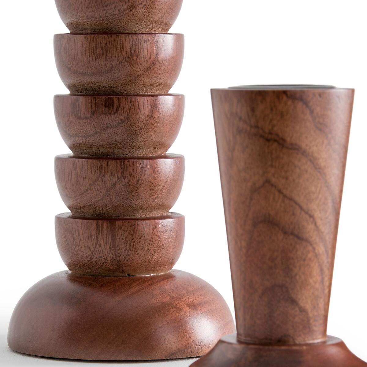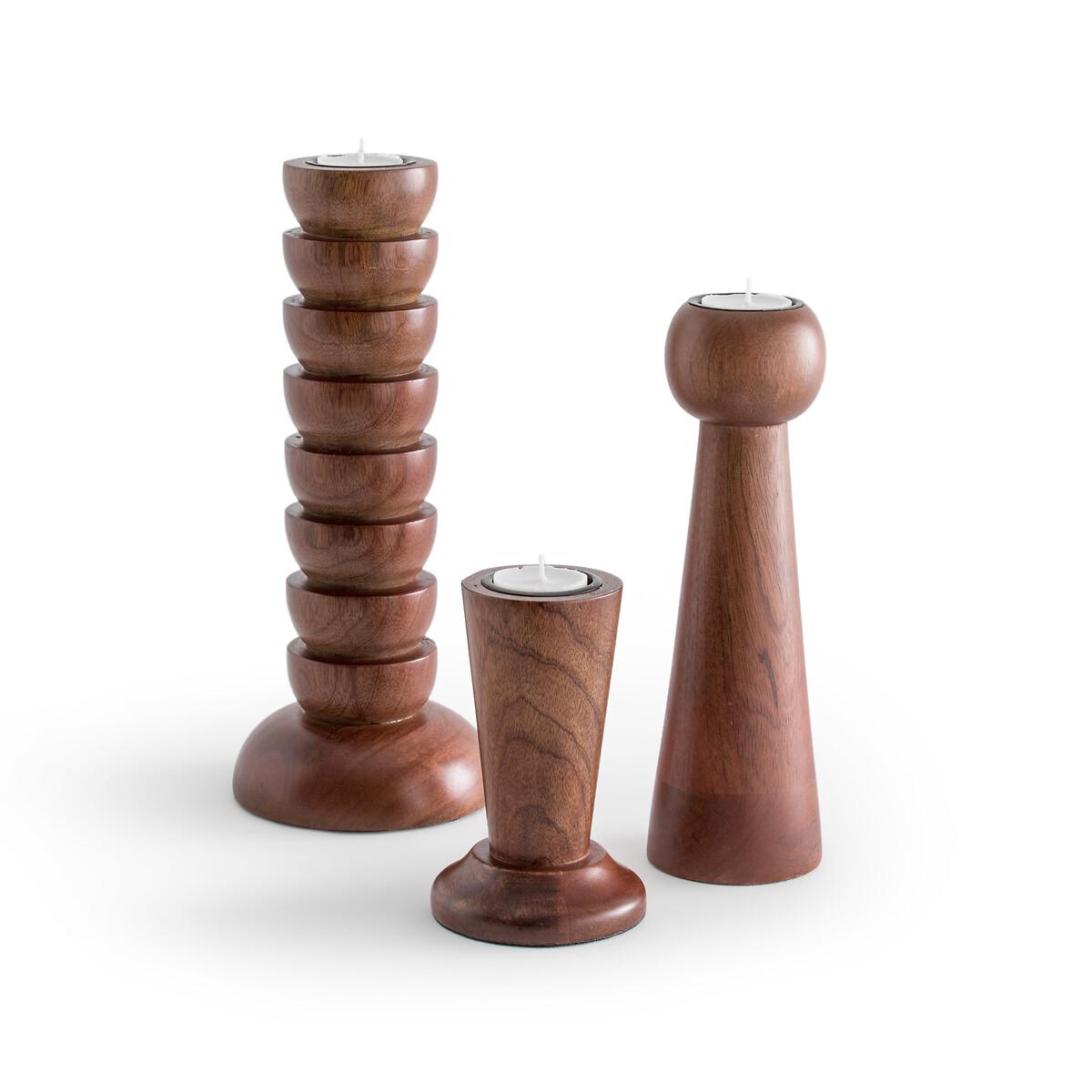 A touch of zen. This set of walnut-stained candlesticks brings a natural, graphic note to your decoration. Product Details • Mango wood, walnut tint • For tealights (not included) • Sold in packs of 3. Quality • Wood is a living material. The differences in shades, grains and knots reinforce its character. Over time it may crack slightly. It is a natural process due to variations in temperature and humidity. Dimensions • 10.5 x 28cm • 15 x 33cm • 11.5 x 40cm Parcel dimensions and weight • 1 parcel • L48 x H48 x D36 cm