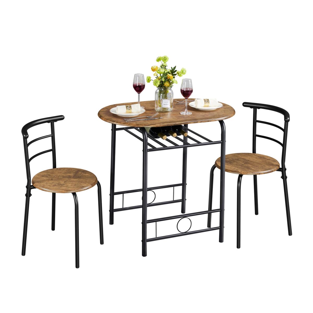 Create a cozy dining area with this practical dining table set. This set is made of premium CARB P2-compliant MDF boards and a metal tube structure, which is sturdy enough for years of use. Featuring a waterproof tabletop and powder-coated steel legs, daily maintenance will be super easy. Given 2 chairs, you can enjoy coffee or breakfast alone,with your partneror friend comfortably. When the chairs are pushed in, thiscompactdiningset takes up very little room, which is perfect for small spaces. This set showcases curved lines and round edges and gives you a relaxed and inviting feeling. The timeless colour scheme and small dimensions make this set perfect for kitchens, balconies, bedrooms, apartments, dorm rooms, offices, cafs, temporary activities, etc.
