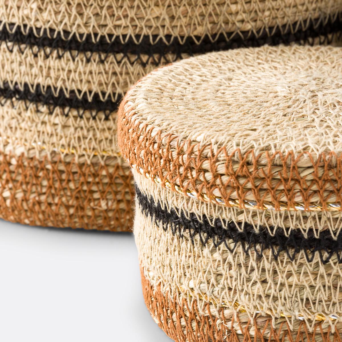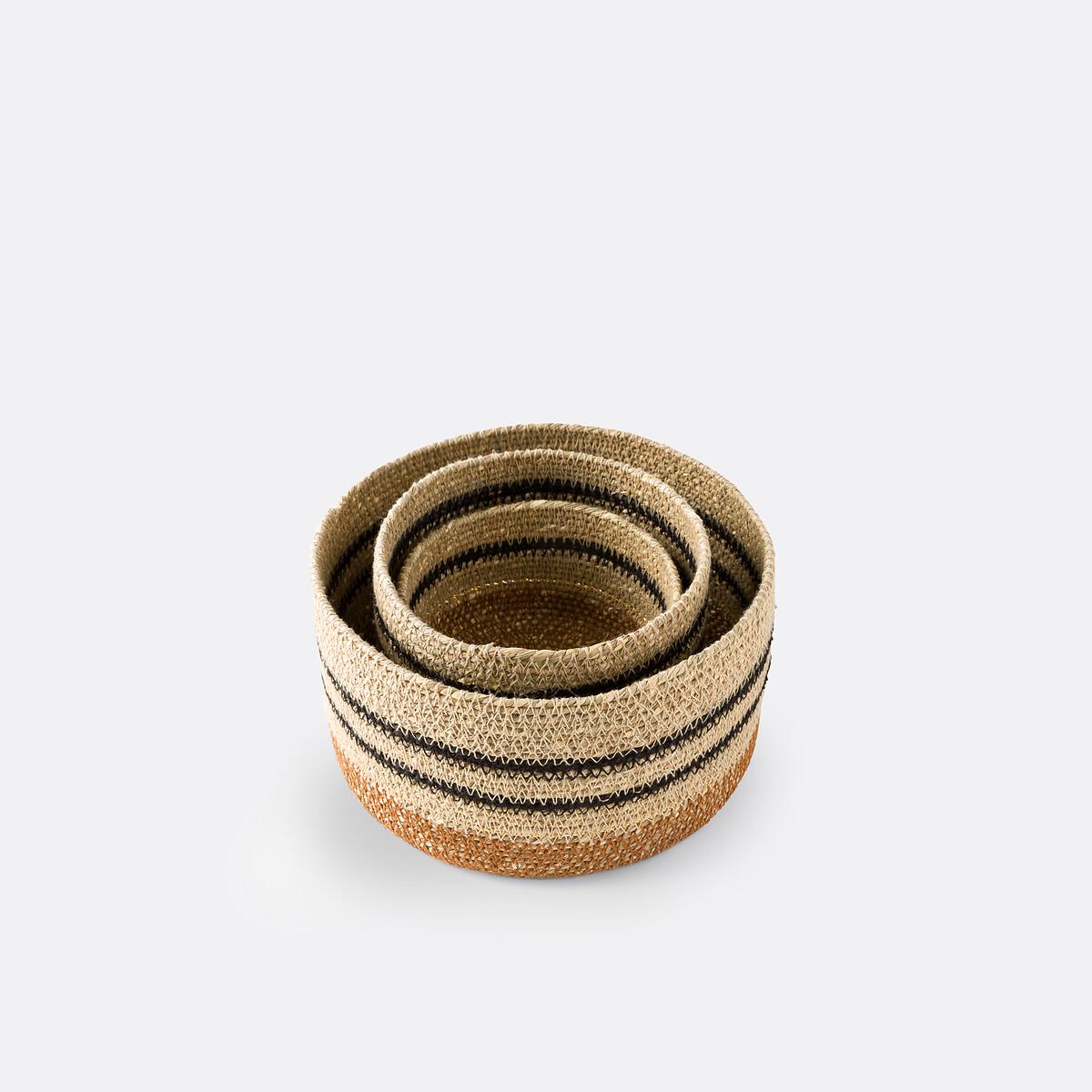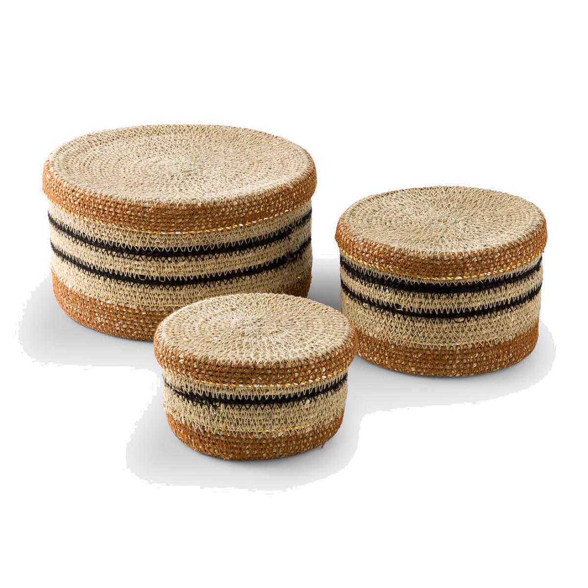 These 3 Saski baskets combine craftsmanship and functionality. Their small size allows them to be used as tiny storage pots - to hold small objects, keys or jewellery - or to display them on a decorative shelf.. Product Details • Seagrass • Baskets with colourful stripes, with lids • Nesting baskets • Set of 3 different sized basketsDimensions Size 1 • Diameter 12cm x Height 8cm. Size 2 • Diameter 15cm x Height 10cm. Size 3 • Diameter 20cm x Height 12cm