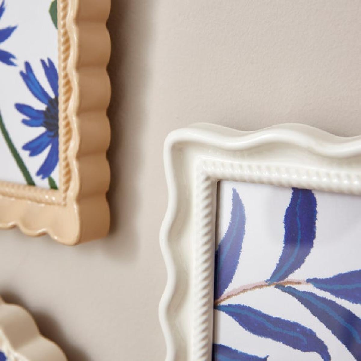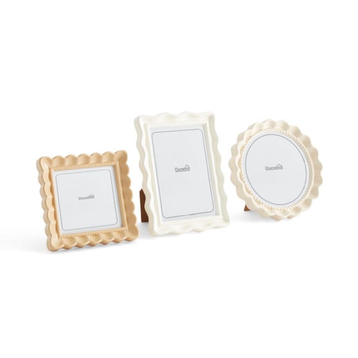 * Set of 3 frames * Decorative scalloped design * Freestanding or wall hung * Tonal neutral colours Add a touch of style to your home with this set of three decorative photo frames, featuring an elegant scalloped edge for a stylish finish. Designed in tonal neutral shades, they blend effortlessly with any décor, from modern minimalism to cosy classic interiors. Each frame can be displayed freestanding or wall-mounted, giving you flexibility to create your perfect arrangement. Ideal for showcasing cherished memories in a coordinated look across shelves, mantels, or gallery walls, this is a versatile set that brings texture and sophistication to your living space. Photo sizes: 6" x 4", 5" x 5" and 4" x 4".
