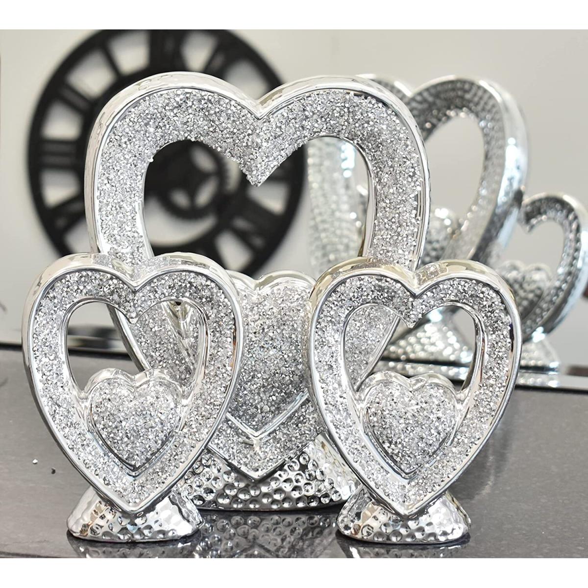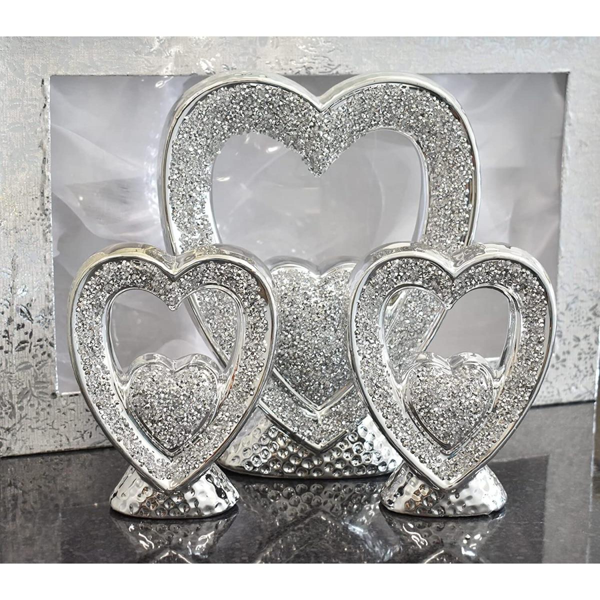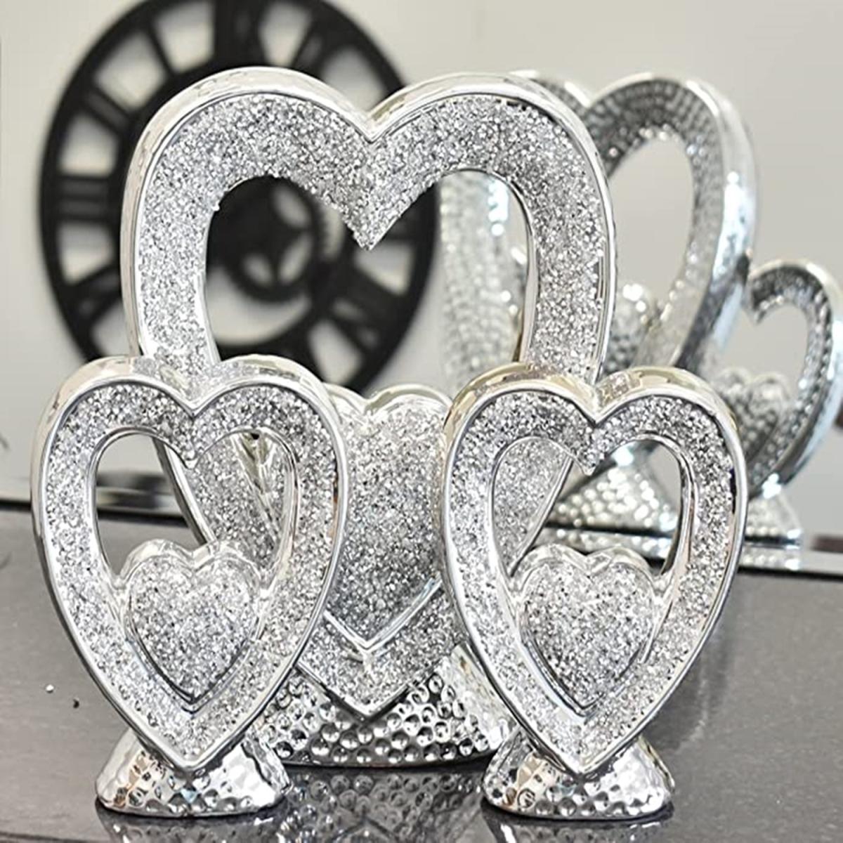 This set of three silver hearts sparkle ornaments is a versatile addition to many interiors. I love how the crushed diamond effect adds a touch of glamour and texture, making them ideal for modern, contemporary, or even glitzy spaces. They work particularly well as centrepieces on coffee tables or mantels, but can also be styled in a glass bowl or tray with other metallic accents for a sophisticated display. For practical styling tips, consider pairing them with minimalist surroundings to let their shimmer stand out, or in a themed Christmas setting where their sparkle will add festive elegance. Their varying sizes also allow for dynamic arrangements, making them a great choice for adding interest and a bit of luxe to everyday or special-event decor.
