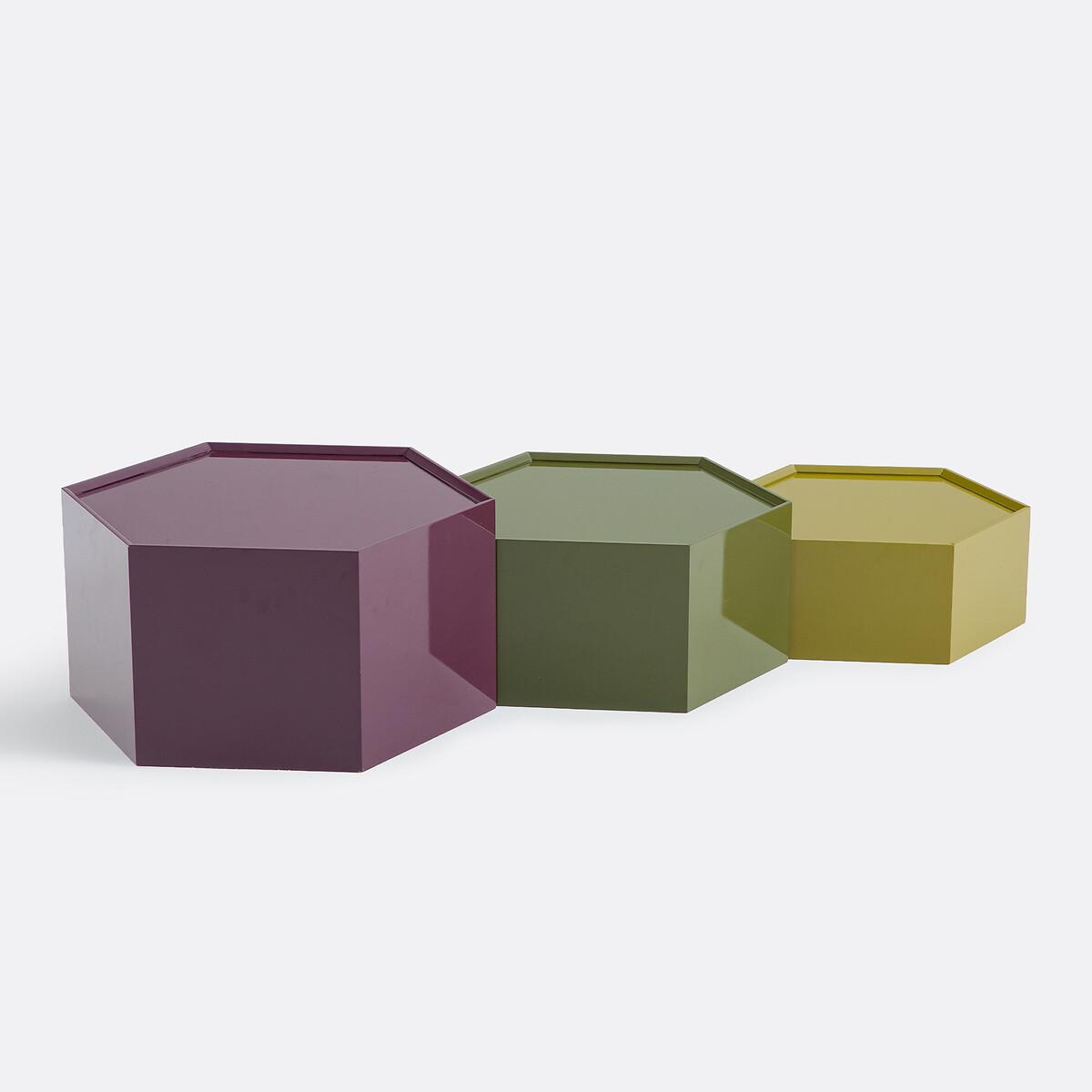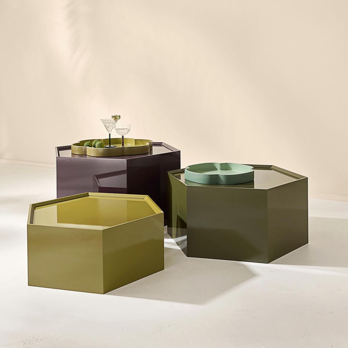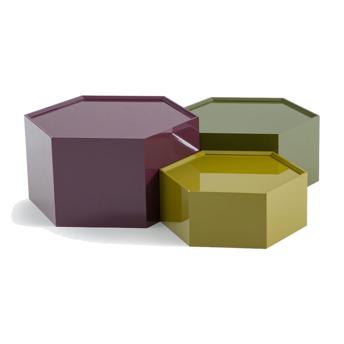 Interplay of heights. Mix of colours. Introducing Wai, the 3 coffee tables in the same hexagonal shape, full of modernity. They sparkle with lacquered wood and practicality. To be arranged scattered, grouped or stacked in the living room. A product designed by our La Redoute Intérieurs designers. Product Details • MDF and melamine, gloss polyurethane lacquer finish • Hexagonal shape • 3 different heights and 3 different colours. Care advice • To protect your coffee tables, consider trivets, coasters and placemats. Dimensions Model 1 • Length: 60cm • Height: 35cm • Depth: 60cm • Weight: 13kg Model 2 • Length: 54cm • Height: 28cm • Depth: 54cm • Weight: 10kg Model 3 • Length: 48cm • Height: 21cm • Depth: 48cm • Weight: 7kg • Sold pre-assembled. • WOOD FROM SUSTAINABLY MANAGED FORESTS. FSC® certified wood comes from forests that are environmentally, socially and economically well managed. Dimensions and weight of parcel1 parcel • W71 x H36 x D62cm, 34.1kg