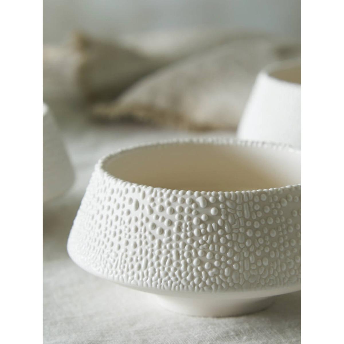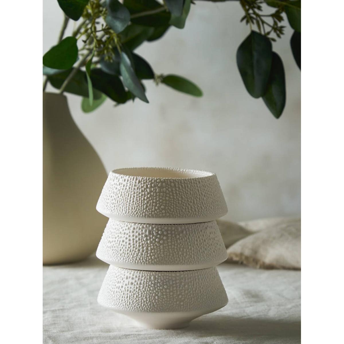 The perfect way to create a wonderful atmosphere on your deign table, these ceramic tealight holders have a footed base and wide angular upper which appears to make them float. Finished in a matt ceramic which has been speckled with dots to give a more textured finish. Sold as a set of 3.
