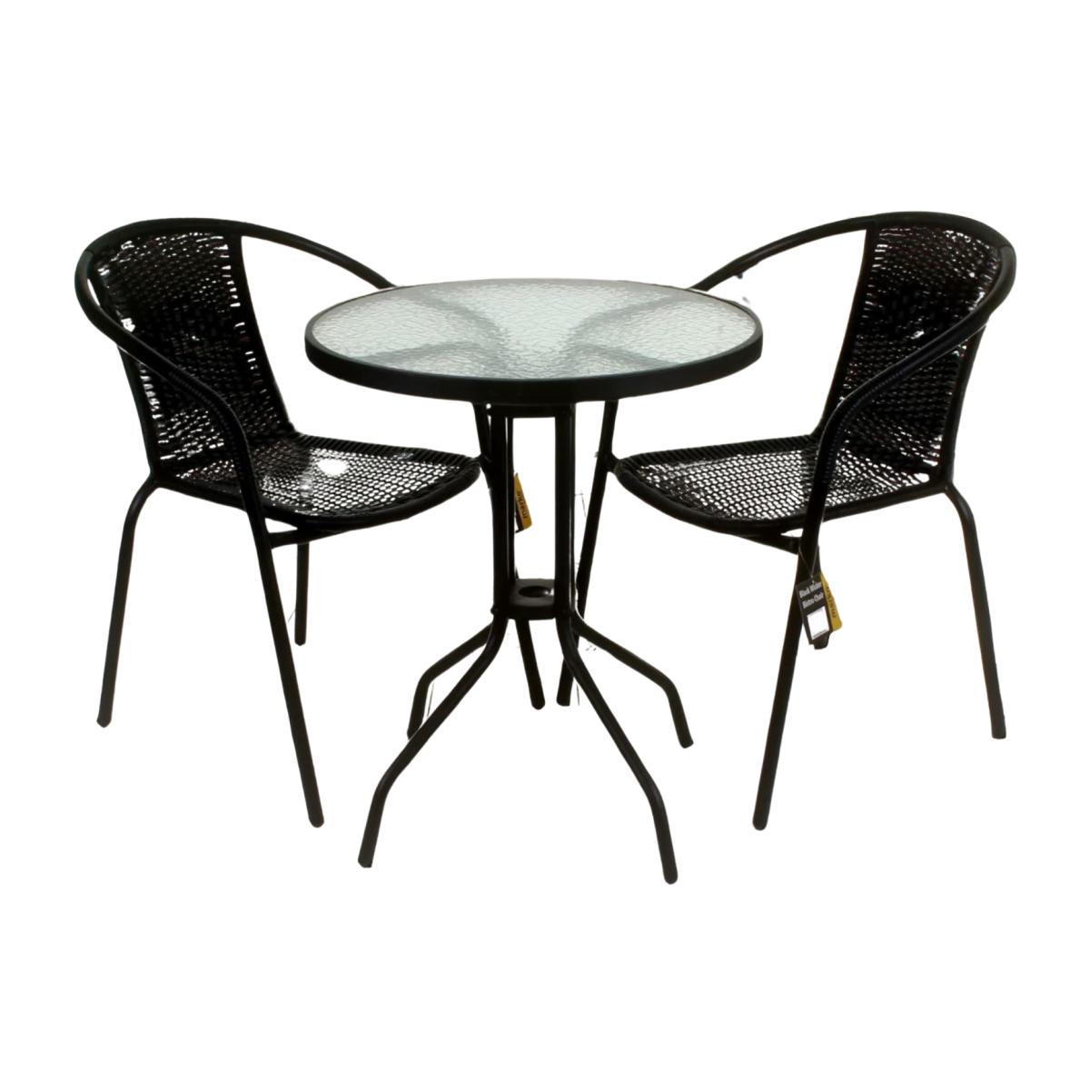 Chairs stack inside each other neatly. Dimensions of two stacked chairs 54cm (W) x 60cm (D) x 77cm (H). Black wicker and metal chairs. Dimensions 53cm (W) x 55cm (D) x 73cm (H). Seat height from floor 42cm. Features a glass-topped table. Dimensions 60cm (Diameter) x 71cm (Height). Equipped with rubber feet for enhanced steadiness and floor protection. Effortlessly complements your garden decor with its elegant appearance. Simple assembly process and easy to clean and maintain.