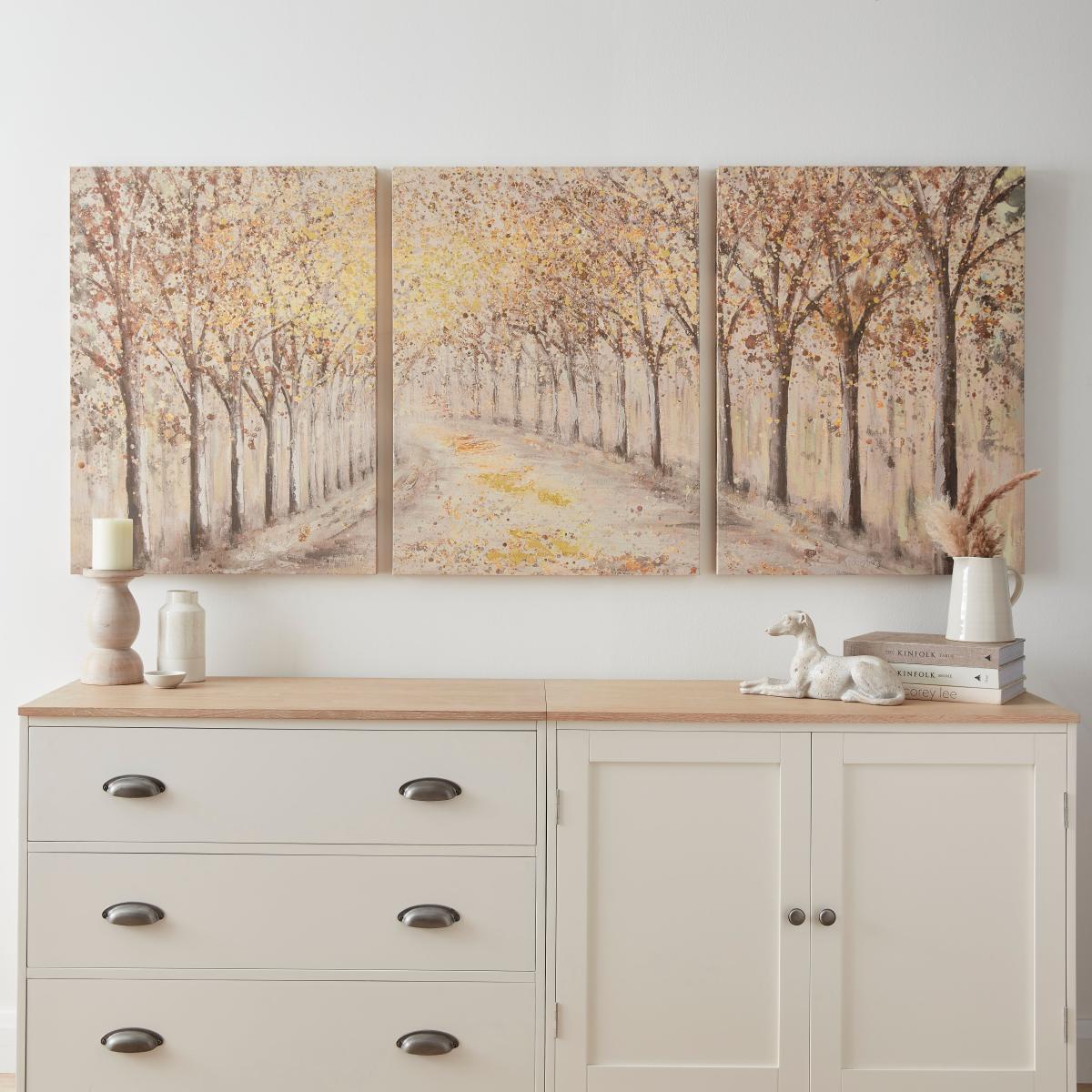 I love this trio of woodland canvases for adding a touch of warmth and serenity to a space. Their earthy tones work particularly well in rustic or neutral interiors, creating a calming focal point above a sideboard or sofa. For styling, consider pairing them with natural materials like wood and linen to enhance the organic feel. They also work well in bedrooms or cosy living rooms, where their understated charm can serve as a gentle backdrop. To keep the look cohesive, stick to a soft, neutral colour palette around them and avoid cluttering the wall. Overall, they’re a versatile piece that can effortlessly bring a bit of the outdoors inside.