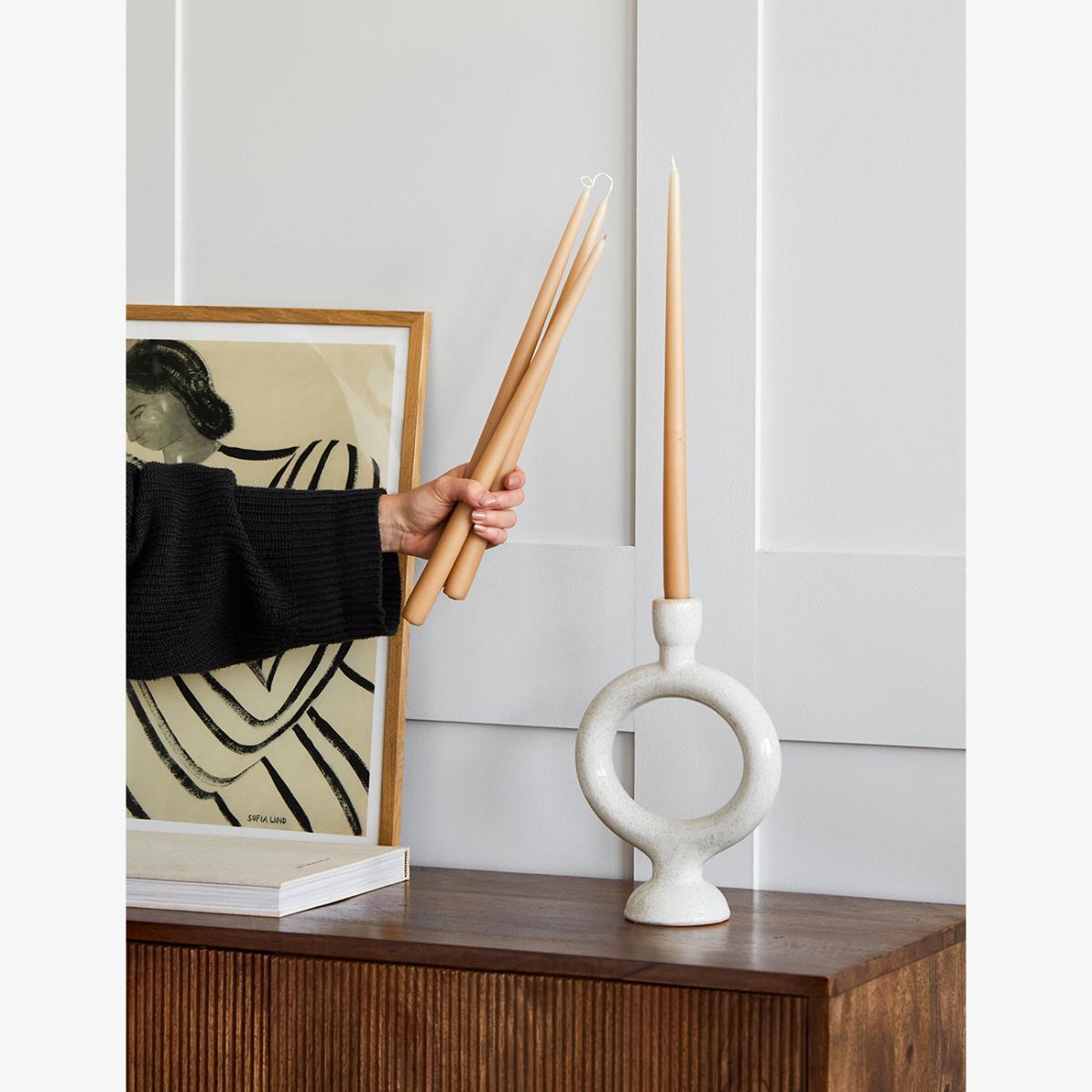 Set the atmosphere with our Set of 4 Cashew Taper Candles, a must-have for any table setting or dinner party. These taper candles are 38cm tall with 10.5 hours of burn time from high-quality wax. The candles arrive boxed and will burn with a beautiful steady flame, only incurring minimal dripping. They are unscented and feature an ombre design, perfect for adding extra detail to your home interior. Also available in shades Auburn and Rust.
