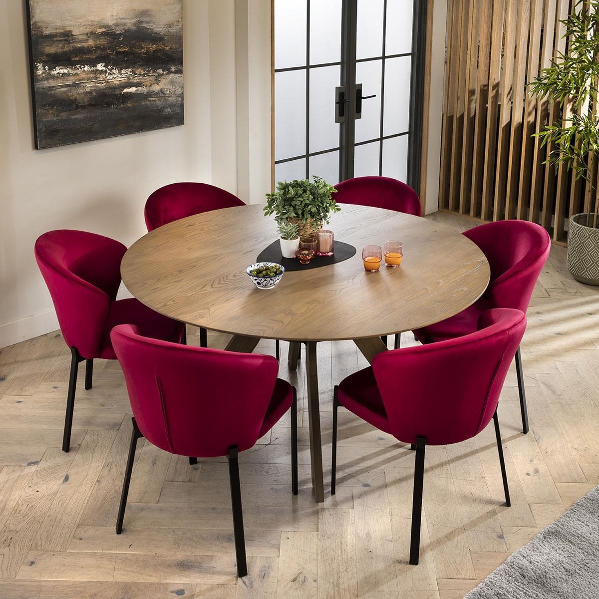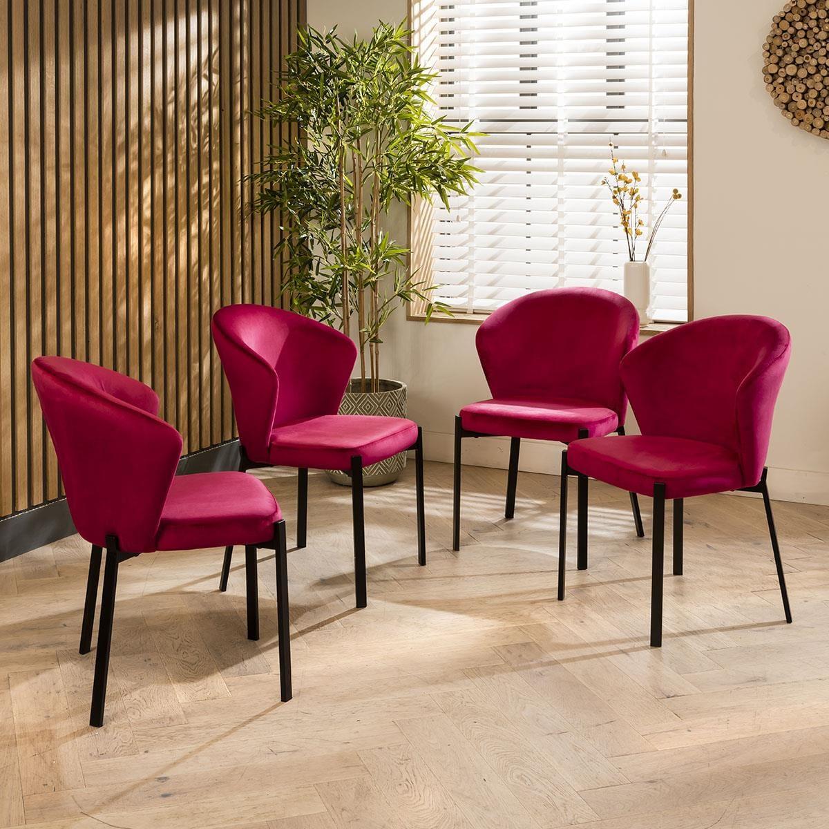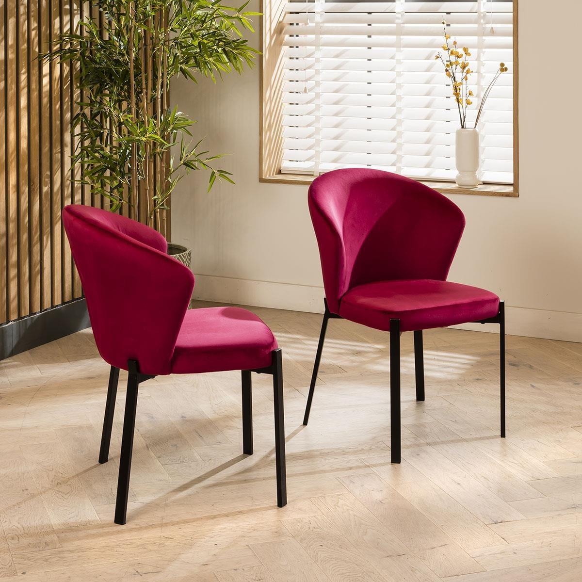 For a harmonious blend of elegance and comfort that will elevate your dining experience. Crafted with the utmost attention to detail, the Zoe dining chair boasts luxurious berry red velvet upholstery with sleek black metal legs. This set of red velvet dining chairs have cushioned seats that offer unmatched comfort. Designed to make a statement, the Zoe dining chairs showcase a unique flared wing back style backrest. This distinctive feature not only enhances the chair's aesthetic appeal but also offers excellent support, making your dining hours delightful and relaxed. Adding a touch of comtemporary edge to its design, the dining chair features sleek black metal legs. These sturdy and stylish legs provide stable support while perfectly complementing the velvet upholstery. The contrast between the striking black finish and the velvety fabric creates a visually stunning effect that effortlessly catches the eye. The Zoe modern dining chair is more than just a piece of furniture; it's a work of art that enhances your dining space's aesthetic while offering unmatched comfort. Upgrade your dining area with our premium red velvet dining chairs featuring a flared wing back style backrest and sleek black metal legs. Immerse yourself in luxury as you indulge in culinary delights, surrounded by a fusion of comfort, style, and sophistication. Elevate your home's ambiance with these stunning dining chairs that combine timeless elegance with modern design. W57cm D62cm H83cm Seat Width 57cm, Seat Depth 45cm, Seat Height 46cm Soft Touch Red Velvet Dining Chairs