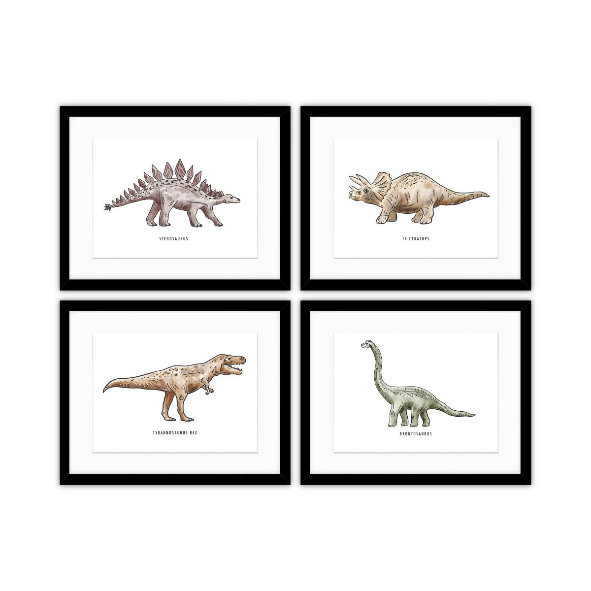 * Framed and ready to display * Detailed illustrations * Set of 4 This set of four framed dinosaur illustrations brings a fun, educational touch to any room. Featuring the iconic species Stegosaurus, Triceratops, Tyrannosaurus Rex, and Brachiosaurus, each print is mounted and finished with sleek black frames for a minimalist look. The glass finish adds a touch of refinement, while the simple white background keeps the design clean and modern. Perfect for children’s rooms or play areas, these prints also complement contemporary and educational interiors. Ready to hang, they bring instant, low effort style to your space.