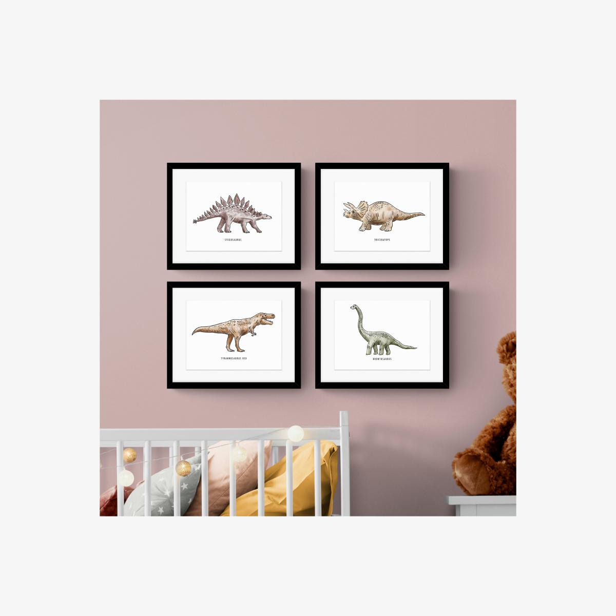 I love this set of four dinosaur prints for adding a playful and educational touch to a child's bedroom or playroom. They're versatile enough to work well in both contemporary and more eclectic interiors, especially when paired with neutral or pastel shades that emphasise their colourfulness. When styling, consider grouping them above a bed or on a feature wall to create a focal point, or mix with other nature-inspired artwork for a curated look. To keep the look balanced, opt for simple framing, like the black surrounds here, which ground the prints without overwhelming the space. Practical tip: pair them with minimal shelving or storage solutions nearby to keep the kids' zone tidy yet inspiring.