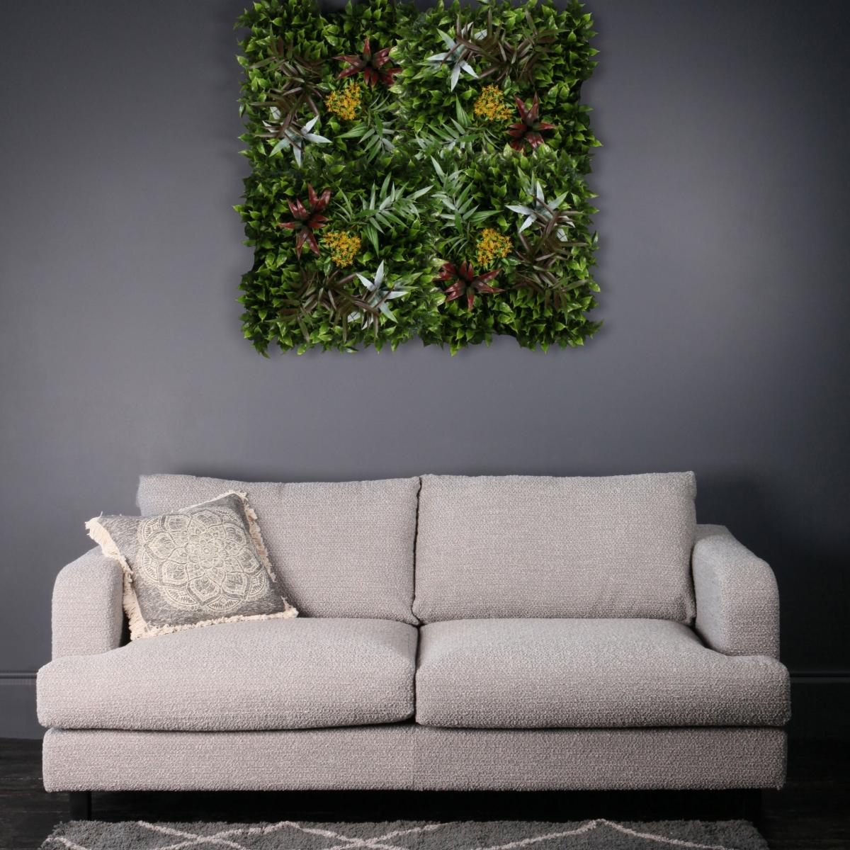 I love this flower wall panel for its versatility and low-maintenance appeal. It works particularly well in contemporary or minimalist interiors where greenery adds texture without clutter. You can use it as a statement feature above a sofa, as seen here, or even to frame a fireplace or doorway for a splash of colour. Practical styling tips include pairing it with neutral furniture to keep the focus on the greenery, or combining different textures of artificial foliage for a more dynamic look. Being artificial, it’s ideal for spaces with limited natural light or where real plants wouldn’t thrive, making it a fuss-free option for adding a lively, natural element to any room.