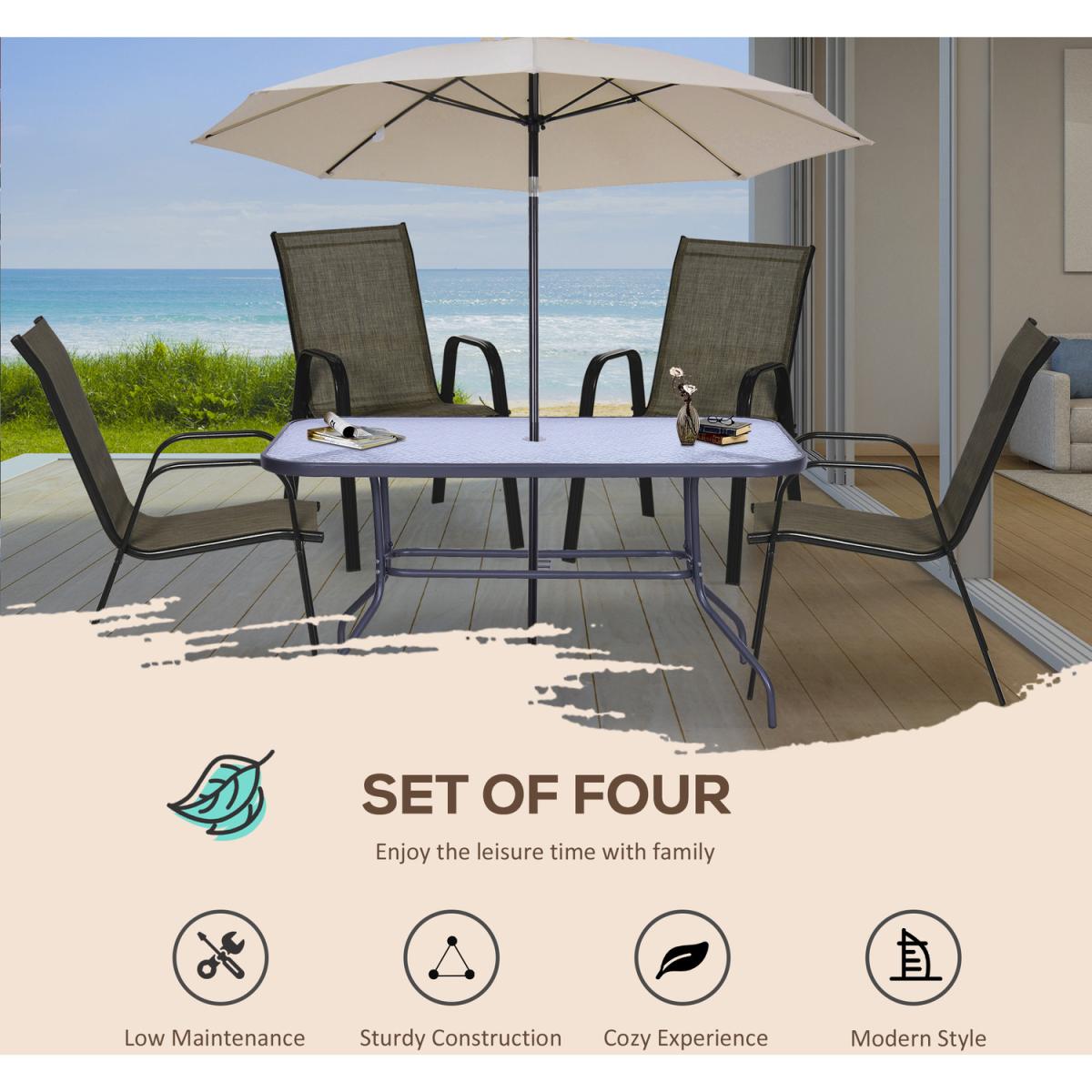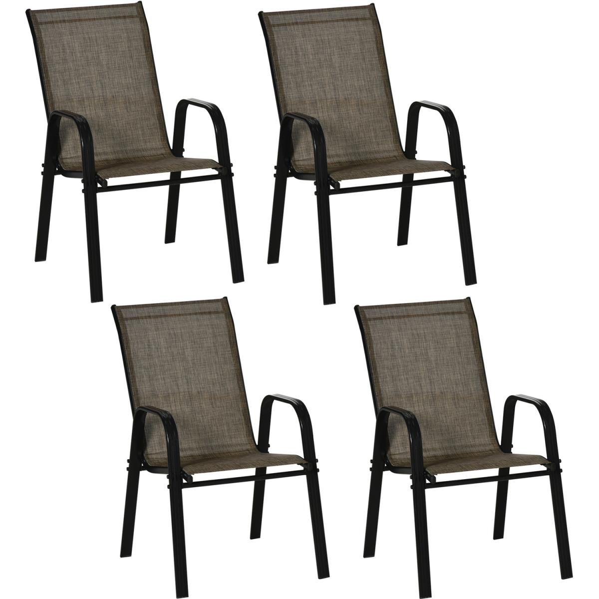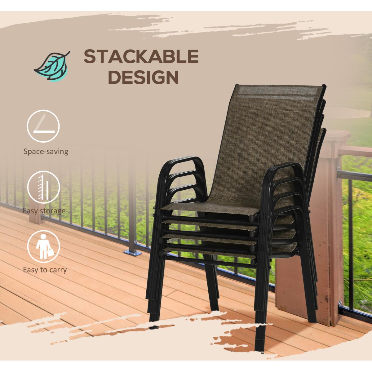Relax outdoor with a friend, thanks this set of four garden chairs from Outsunny. Ergonomic design of high back and armrests to support your body. The breathable mesh fabric is comfortable. The stackable design makes it compact for easy storage. Sit back and relax.
