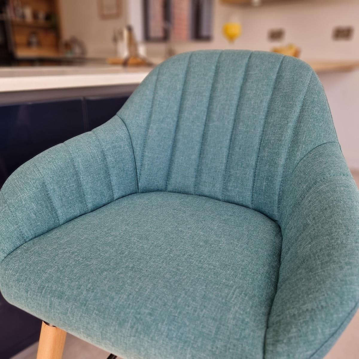 Elevate your home bar or kitchen counter with this set of 4 stylish and comfortable Cream Fabric Bar Stools with Backs, Quilted Line Detailing, and Wrap-Around Arms. The modern bar stool boasts a timeless green fabric upholstery that effortlessly complements any interior decor with wooden legs for a rustic touch. Designed with your comfort in mind, the wrap-around style low arms provide extra support and a cosy feel while you enjoy a drink or engage in conversation. The bar stool also features a convenient backrest that promotes good posture and relaxation. The natural color wooden legs add a touch of rustic charm to your space, blending seamlessly with various design themes. Not only does this bar stool excel in aesthetics and comfort, but its durability is also second to none. The smooth finish on the wooden legs not only enhances its overall look but also ensures easy cleaning and maintenance. The thoughtfully integrated footrest adds an extra layer of comfort, allowing you to sit back and unwind for longer periods without any discomfort. Upgrade your kitchen bar or island with this set of Green Fabric Bar Stools with Quilted Line Detailing and Wrap-Around Arms. Whether it's for casual gatherings or everyday meals, this bar stool combines style, comfort, and functionality in one delightful package. Add a touch of elegance to your space while enjoying the utmost comfort. W52cm D49cm H99cm Seat Height 72cm Set of 4 kitchen bar stools