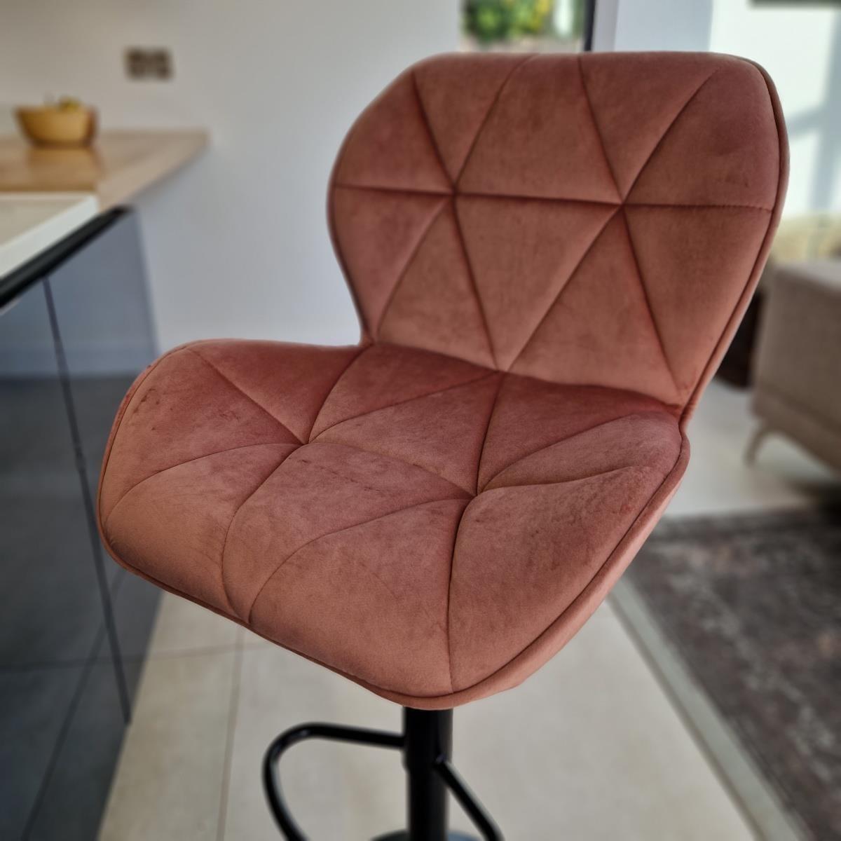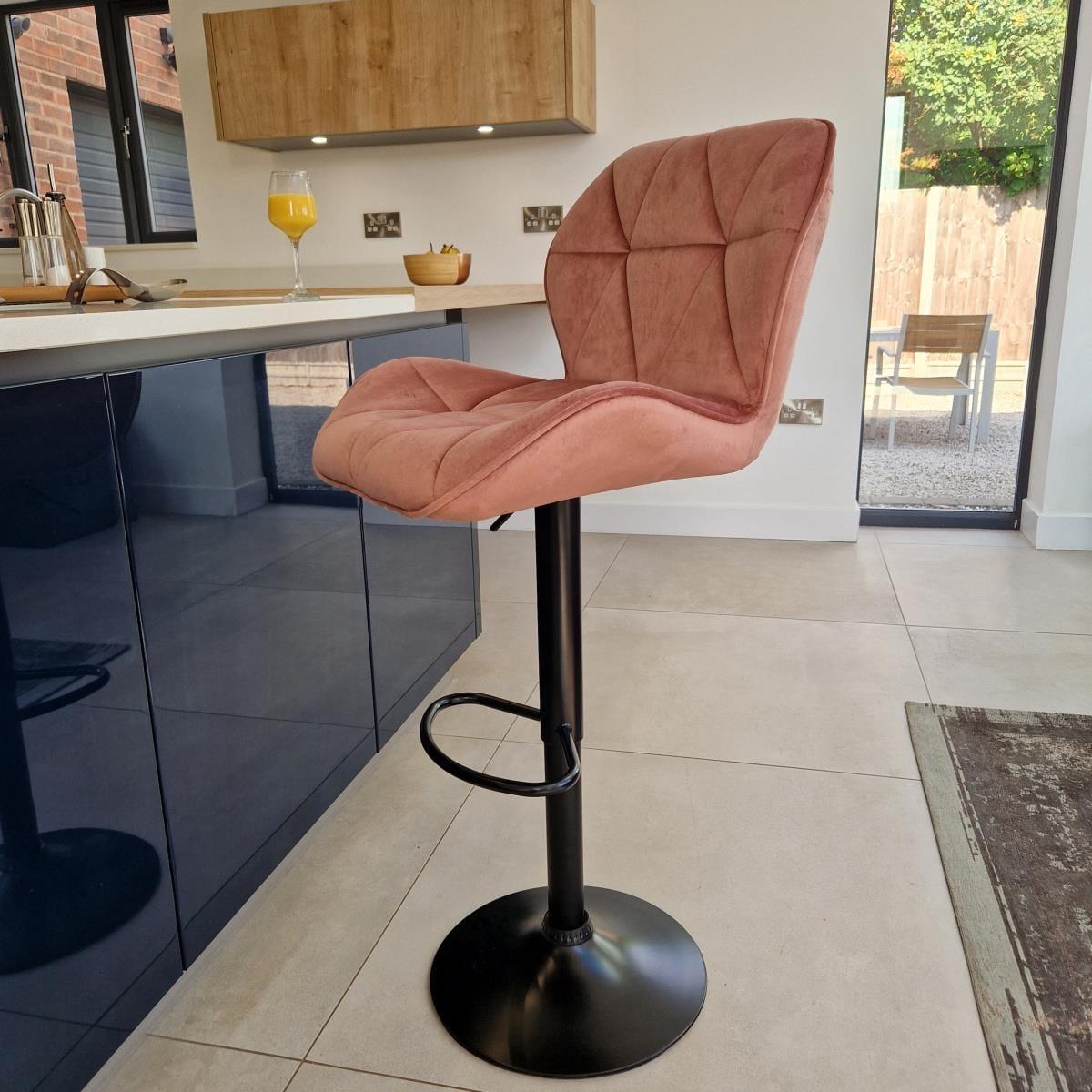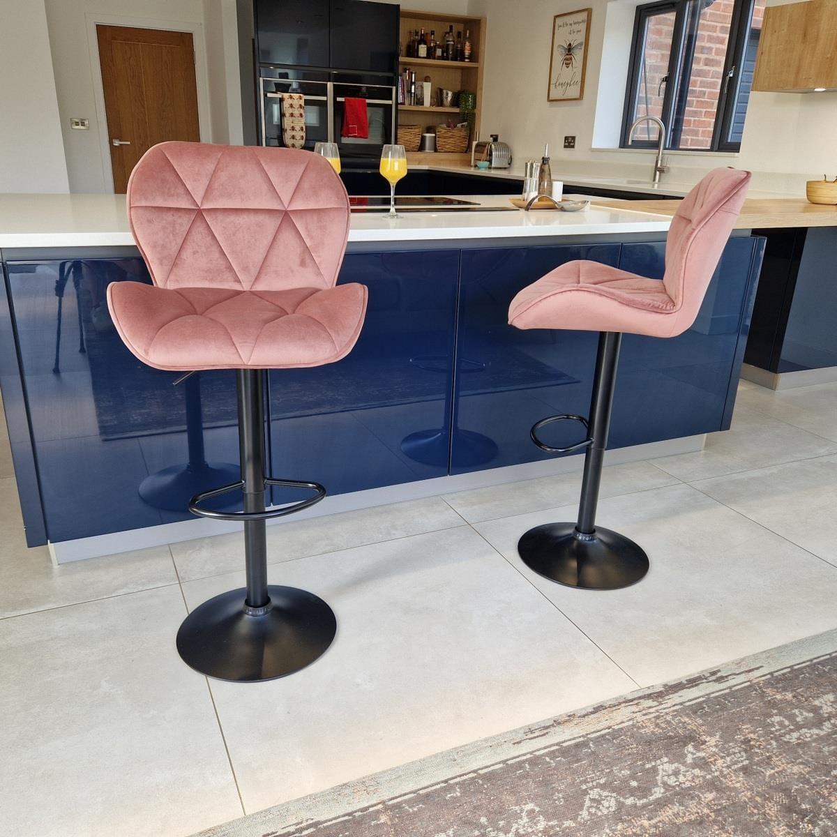 Premium soft velvet and geometric detailing lend this set of 4 bar stools a welcoming feel with evocative design with a modern style, featuring an adjustable gas lift and footrest with a black heavy round base. Combined with the luxurious pink velvet, these modern kitchen bar stools with backs are soft to the touch. The adjustable seat height ensures a customised seating experience, catering to various counter and bar heights. Whether you're hosting a social gathering or enjoying a quiet meal, these bar stools adapt effortlessly to your needs. The ergonomic design includes a supportive backrest, offering optimal lumbar comfort and encouraging good posture, even during extended periods of use. Not only are these bar stools a treat for the senses, but they also prioritise practicality. The thoughtfully integrated footrest enhances stability while providing a comfortable spot to rest your feet. Our bar stools strike the perfect balance between contemporary aesthetics and functional design, making them an ideal choice for both residential and commercial spaces. Upgrade your decor with these modern bar stools that combine the opulence of pink velvet, the convenience of adjustable height, and the elegance of geometric detailing. Make a statement with furniture that reflects your discerning taste while enjoying the ergonomic design that promises comfort with every seating. Revitalise your space with our exceptional bar stools and experience luxury, style, and functionality like never before. W49cm D58cm H111cm Adjustable Seat Height 61-83cm Set of 4 kitchen bar stools