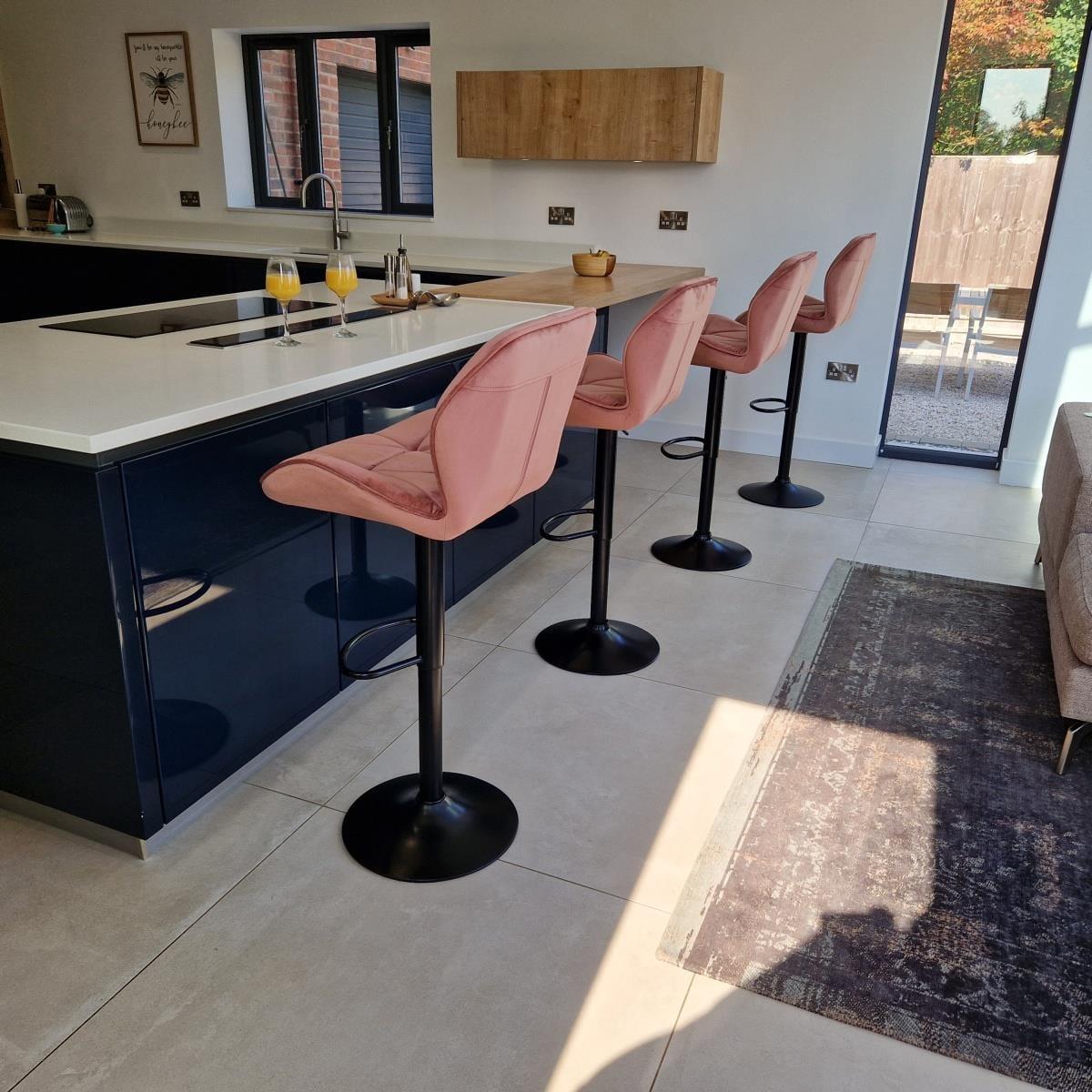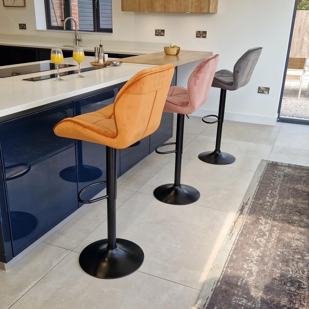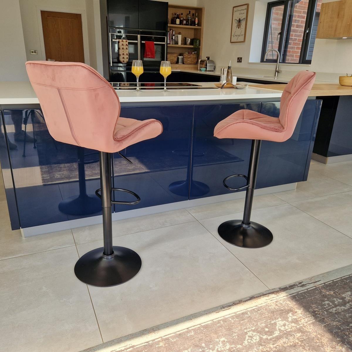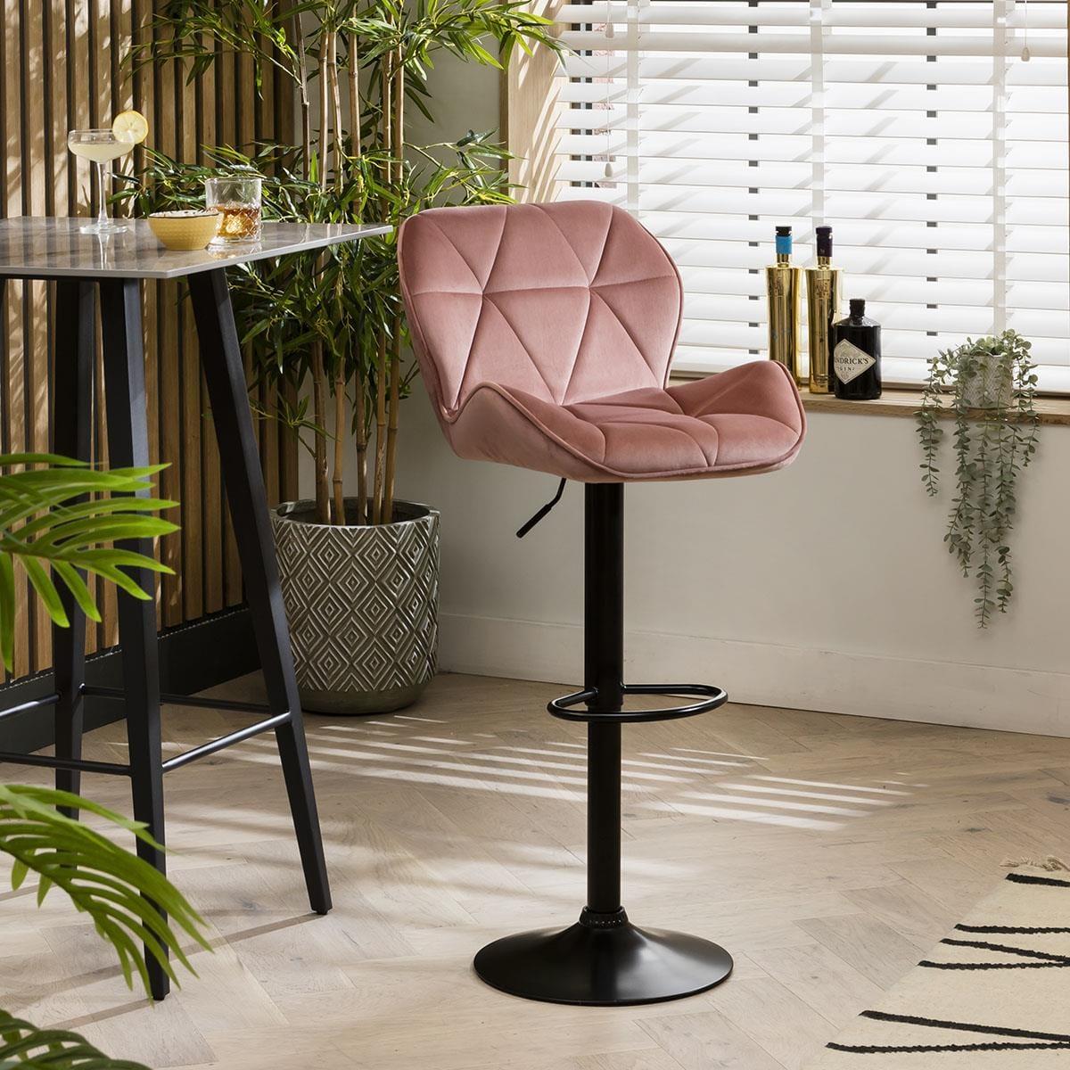 Premium soft velvet and geometric detailing lend this set of 4 bar stools a welcoming feel with evocative design with a modern style, featuring an adjustable gas lift and footrest with a black heavy round base. Combined with the luxurious pink velvet, these modern kitchen bar stools with backs are soft to the touch. The adjustable seat height ensures a customised seating experience, catering to various counter and bar heights. Whether you're hosting a social gathering or enjoying a quiet meal, these bar stools adapt effortlessly to your needs. The ergonomic design includes a supportive backrest, offering optimal lumbar comfort and encouraging good posture, even during extended periods of use. Not only are these bar stools a treat for the senses, but they also prioritise practicality. The thoughtfully integrated footrest enhances stability while providing a comfortable spot to rest your feet. Our bar stools strike the perfect balance between contemporary aesthetics and functional design, making them an ideal choice for both residential and commercial spaces. Upgrade your decor with these modern bar stools that combine the opulence of pink velvet, the convenience of adjustable height, and the elegance of geometric detailing. Make a statement with furniture that reflects your discerning taste while enjoying the ergonomic design that promises comfort with every seating. Revitalise your space with our exceptional bar stools and experience luxury, style, and functionality like never before. W49cm D58cm H111cm Adjustable Seat Height 61-83cm Set of 4 kitchen bar stools