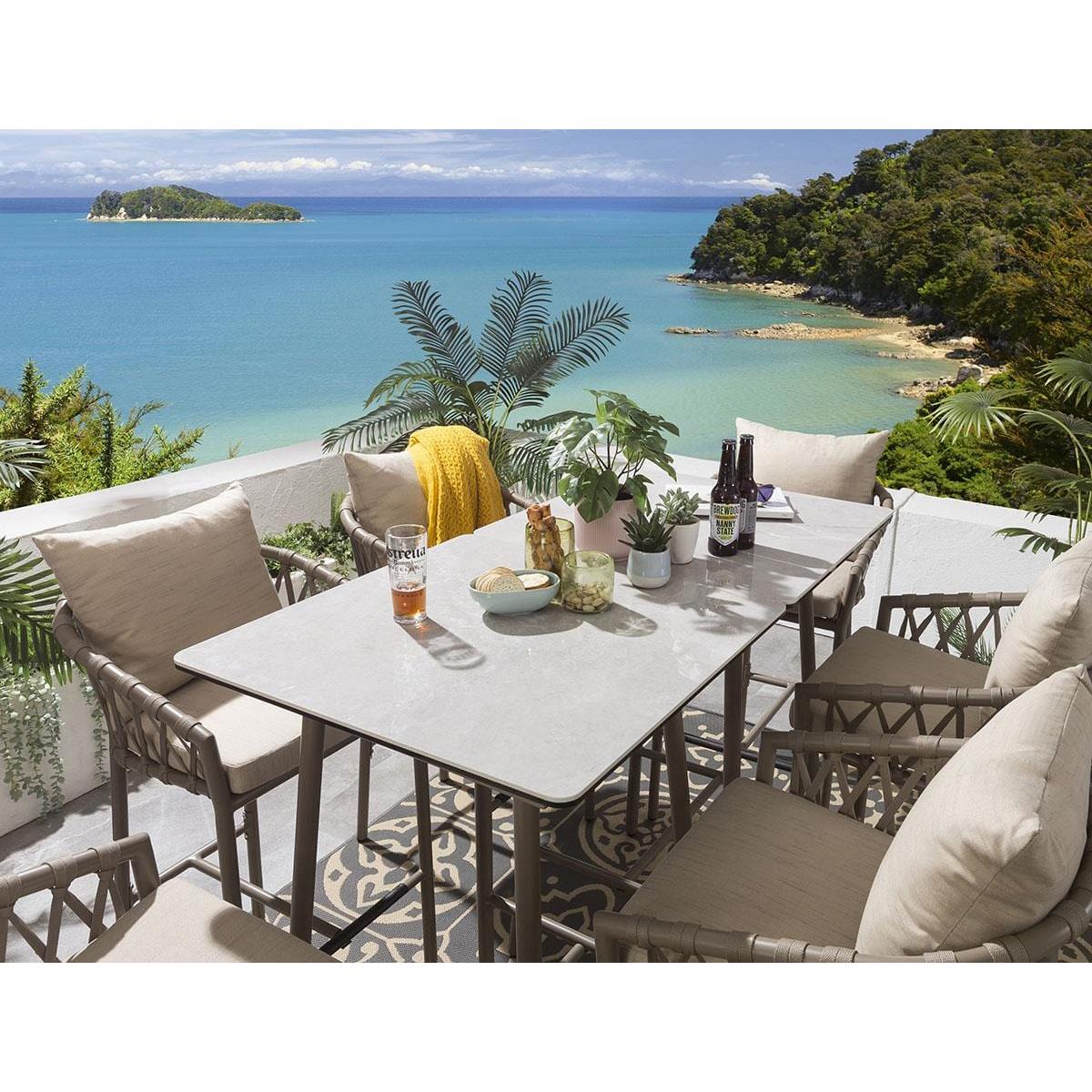 Reinvent your outdoor space with these fabulous all-weather beige rope-back garden bar stools. The generously padded outdoor chairs are enhanced by a supportive back cushion for an extra layer of luxurious comfort. Our gorgeous rope back outdoor bar stools will make a stunning addition to your outdoor seating area or patio. The bar stools come complete with our signature luxuriously thick cushioning that offers unbeatable comfort, topped off with rich Beige high-end marine fabric which has amazing resilience to colour fading and damage caused by extreme weather conditions. Aluminium garden furniture requires very little maintenance, making it the perfect choice for fuss-free alfresco dining. You won't need to scrub it or treat it, just an occasional wipe down with warm soapy water and a clean cloth to keep it looking its best. Expertly crafted aluminium frames are highly durable, complemented by clean lines that lend contemporary style. It is robust and weather-resistant for outdoor use & the super cushioned seating offers comfortable support that's shower-resistant, but we advise that cushions are stored when not in use. W55cm D56cm H101cm Weather resistant aluminium frame and removable cushions Set of 4 Rope Back Garden Bar Stools in Beige