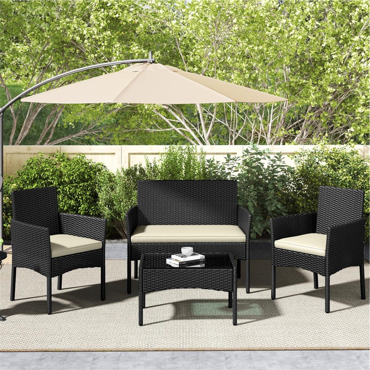 Transform your outdoor space into a cozy retreat with this 4-piece garden sofa and table set. The loveseat, two single sofas, and coffee table are crafted from durable, hand-woven PE rattan, blending strength with a natural, inviting look. The thick foam cushions and ergonomic backs provide all the comfort you need, while the tempered glass tabletop adds a sleek touch. Thoughtful details like suction cup fixing and rounded edges offer safety, and adjustable foot pads make sure the set stays steady on uneven ground.