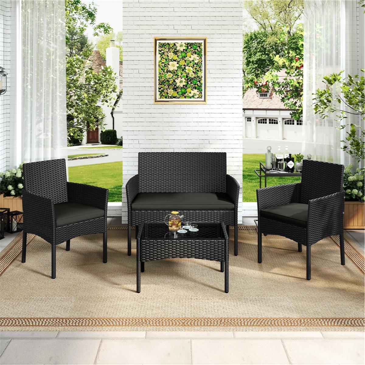 Transform your outdoor space into a cozy retreat with this 4-piece garden sofa and table set. The loveseat, two single sofas, and coffee table are crafted from durable, hand-woven PE rattan, blending strength with a natural, inviting look. The thick foam cushions and ergonomic backs provide all the comfort you need, while the tempered glass tabletop adds a sleek touch. Thoughtful details like suction cup fixing and rounded edges offer safety, and adjustable foot pads make sure the set stays steady on uneven ground.
