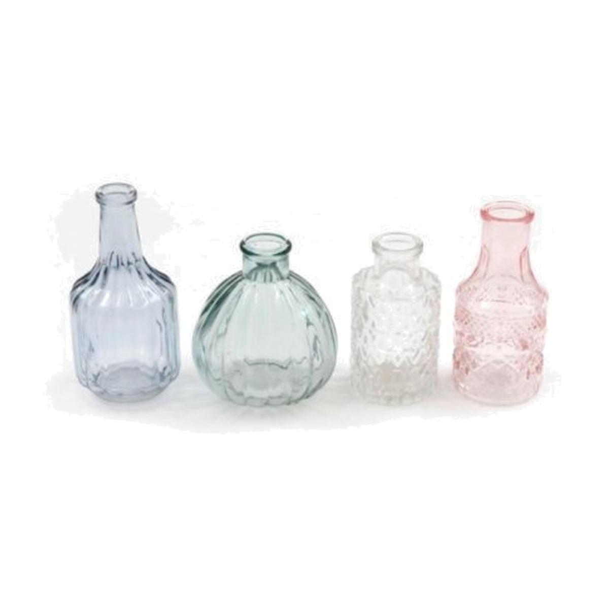 Add a touch of elegance to your decor with this set of 4 dainty glass bottles, each adorned with intricate cut glass patterns and a delicate colour tint. These charming bottles come in a variety of designs, creating a visually appealing ensemble. Whether displayed as pictured or adorned with a small posy of flowers, these bottles make for a pretty accessory that effortlessly enhances any space. The combination of their exquisite craftsmanship and versatility makes them a delightful addition to your home decor, allowing you to showcase your style and creativity with grace.