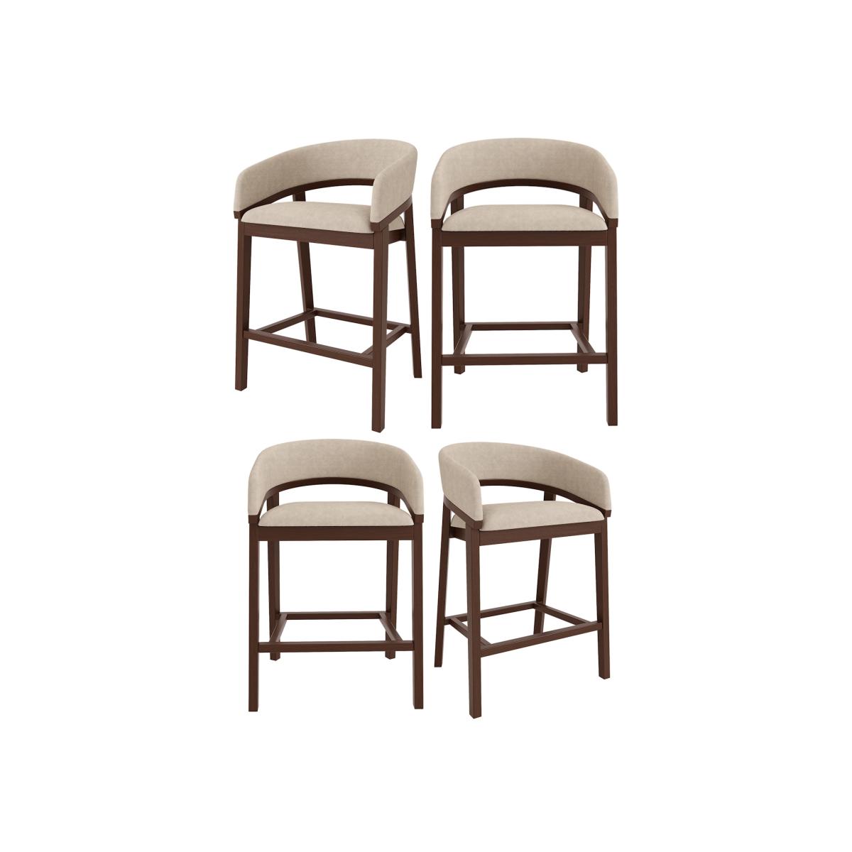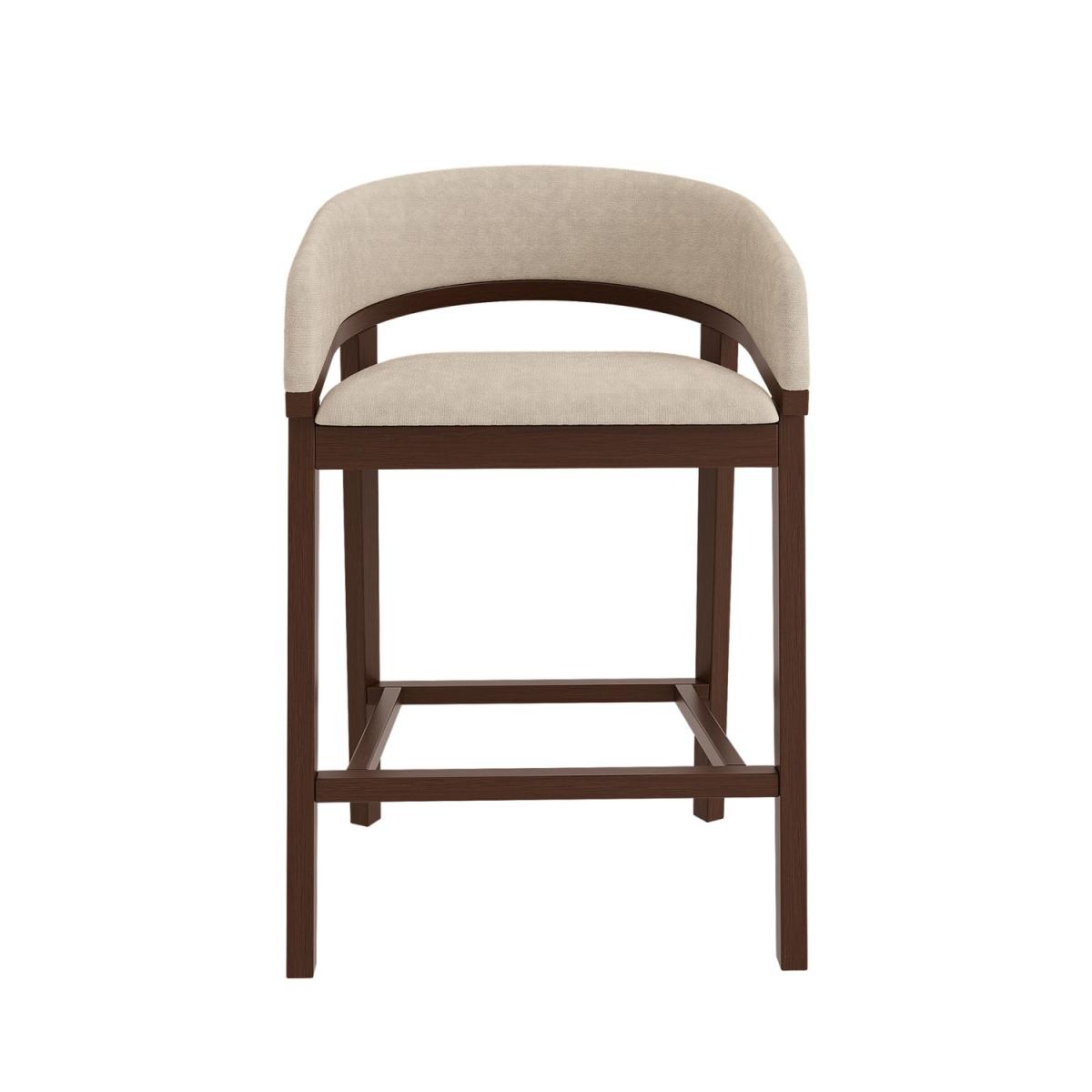 A curved backrest and armrests with a stylish cut-out detail create a sophisticated look. Solid wood construction ensures durability while adding warmth to your space. The beige fabric upholstery provides a soft, inviting seat for dining or relaxing. The rounded backrest provides extra support, combining style and comfort Upgrade your kitchen space with this contemporary curved kitchen stools. Designed with a cut-out backrest and gently curved armrests, it blends modern sophistication with everyday comfort. The soft beige fabric and plush padding create an inviting seat, whether you're enjoying a quick breakfast or entertaining guests. Supported by a sturdy solid wood frame in a warm walnut-stained finish, these stools not only offers a refined aesthetic but also delivers exceptional durability for daily use.