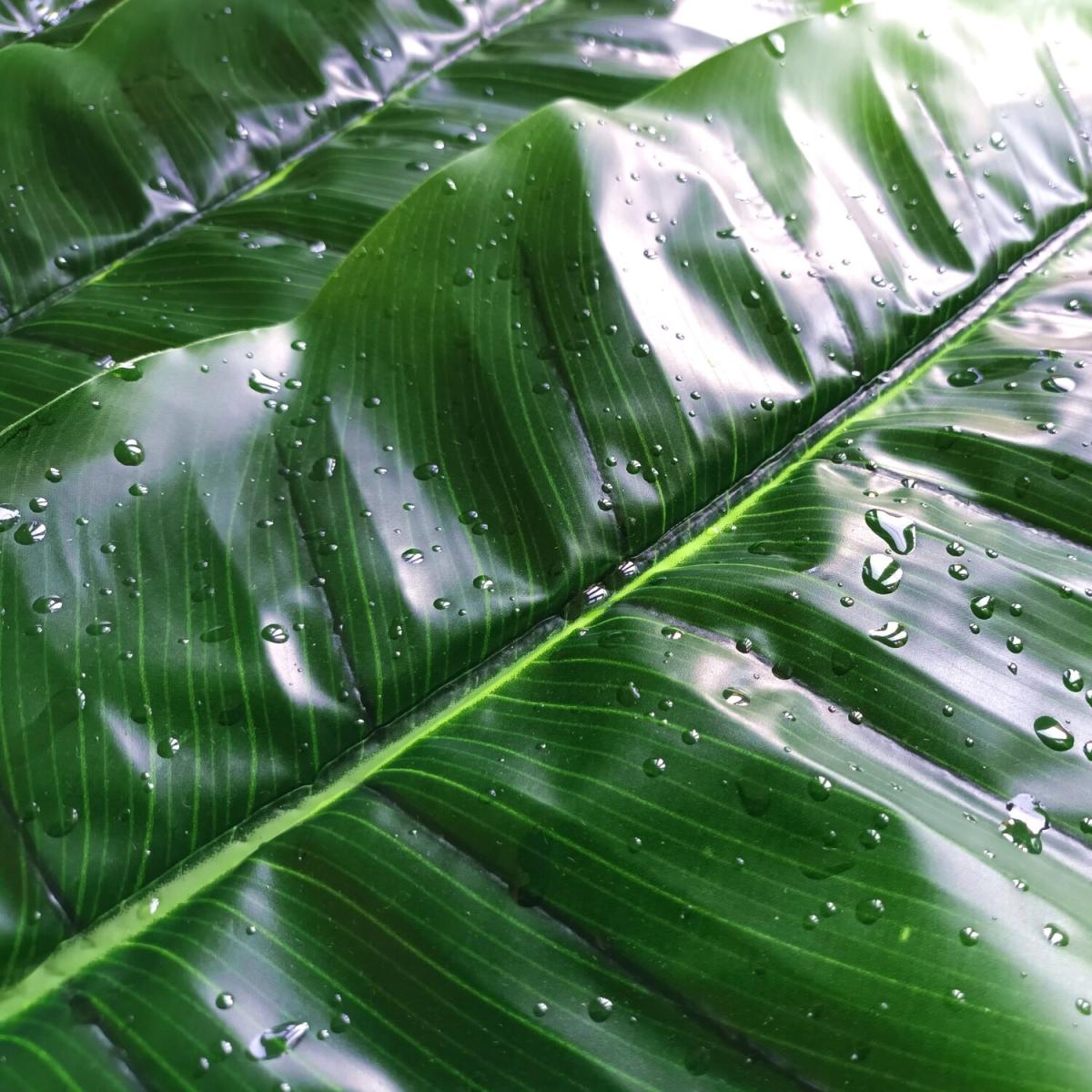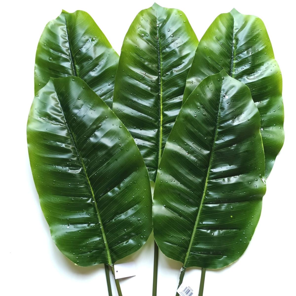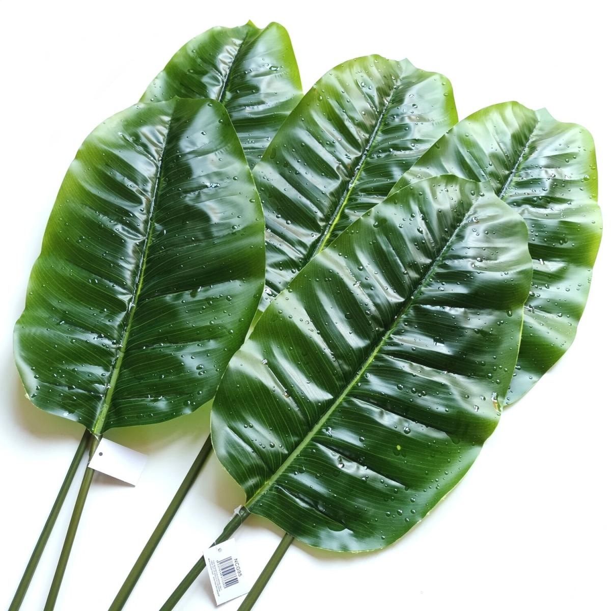 Set of 5 Artificial Banana Leaves with Raindrops. The leaves feel real to the touch and have artificial realistic raindrops giving them a natural straight from the rain forest look. Being nearly 1 meter tall with large leaves these are a fantastic backdrop, corner filler, event room display and even great for shop windows and weddings. Perfect for faux flower craft projects, wedding decorations, gifts and flower displays in lobby areas, hallways, living rooms and entertaining areas.