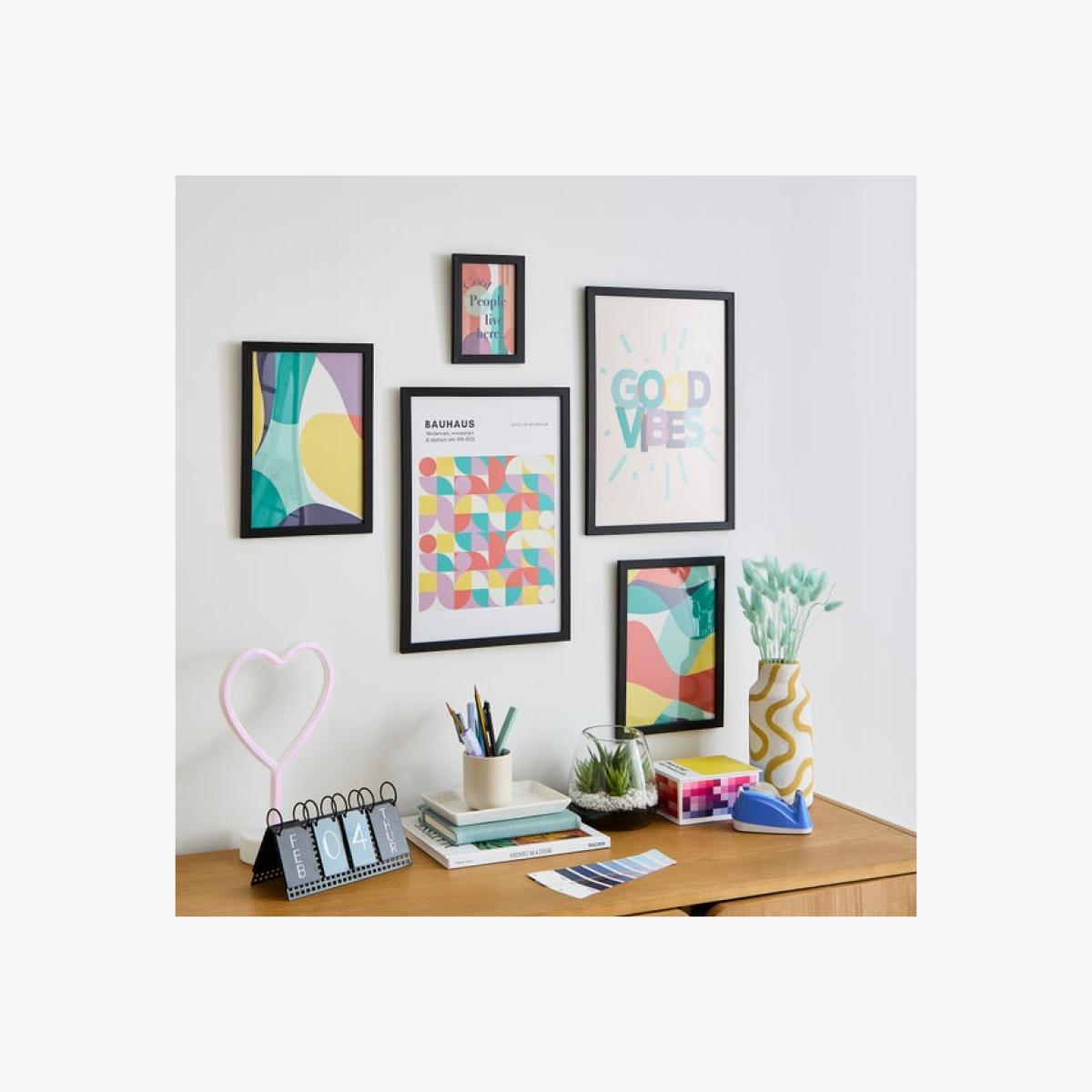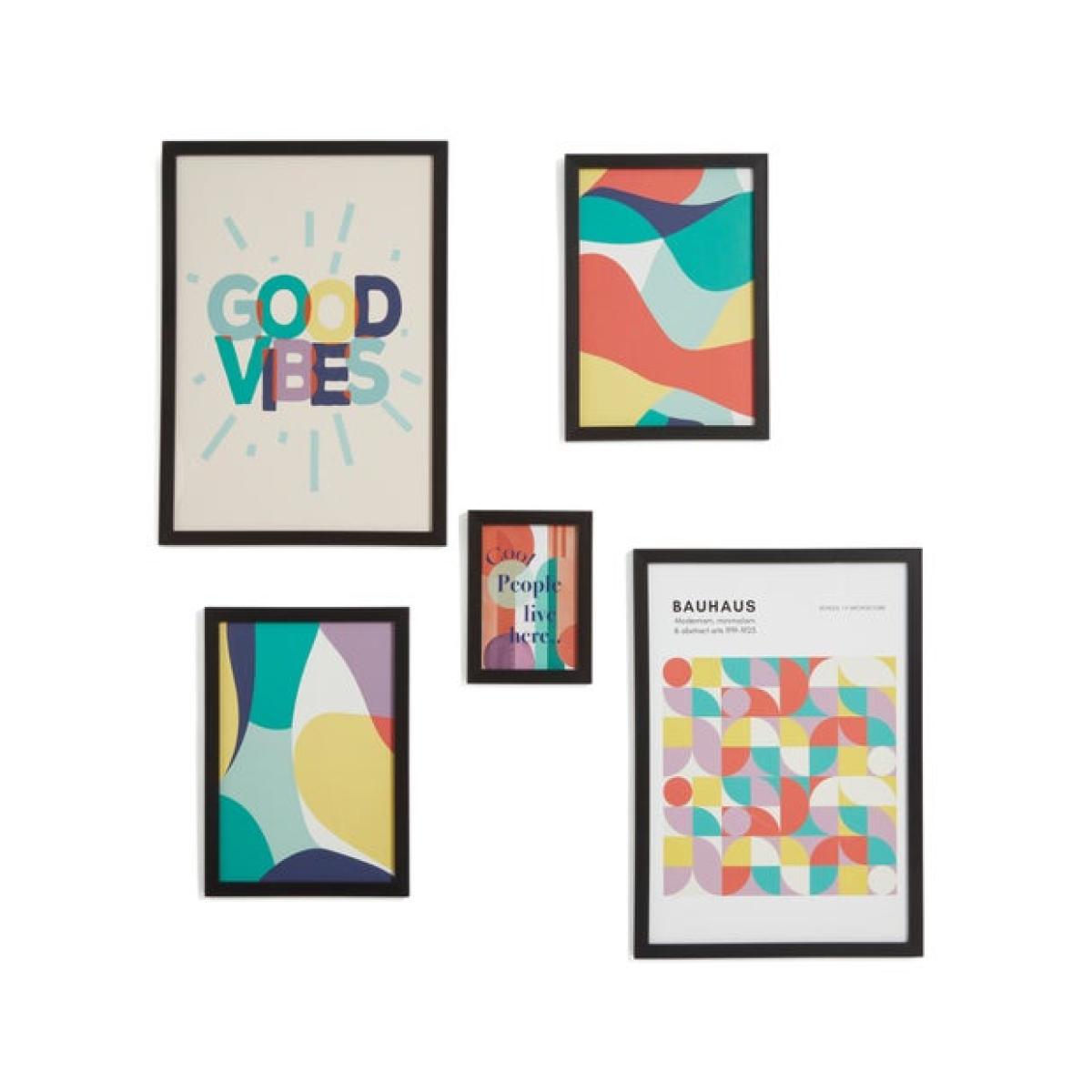 * Set of 5 individual frames * Includes bright prints * Variety of sizes * Perfect for creating your own gallery wall Brighten up your walls with this Set of 5 Framed Brights Prints. Each one features a bold, modern design that brings colour and energy to your space. Hang them together to create your own gallery wall or spread them out to add interest around your home. The frames come ready to hang and can be easily opened, so you can swap in your own photos or artwork whenever you fancy a change. It’s a simple way to refresh your décor and make it feel more personal.
