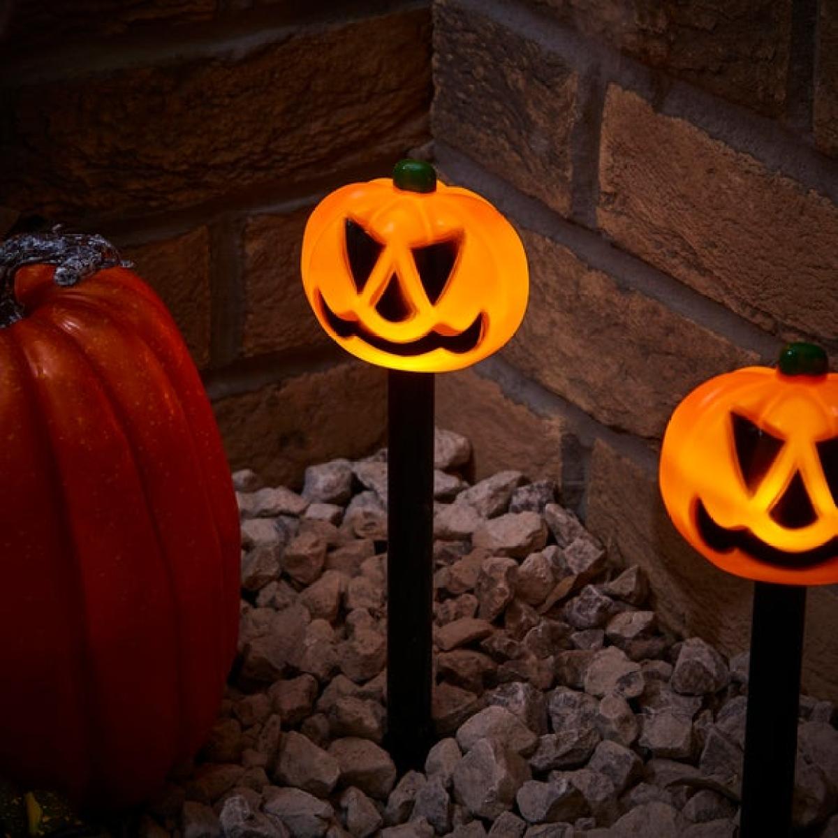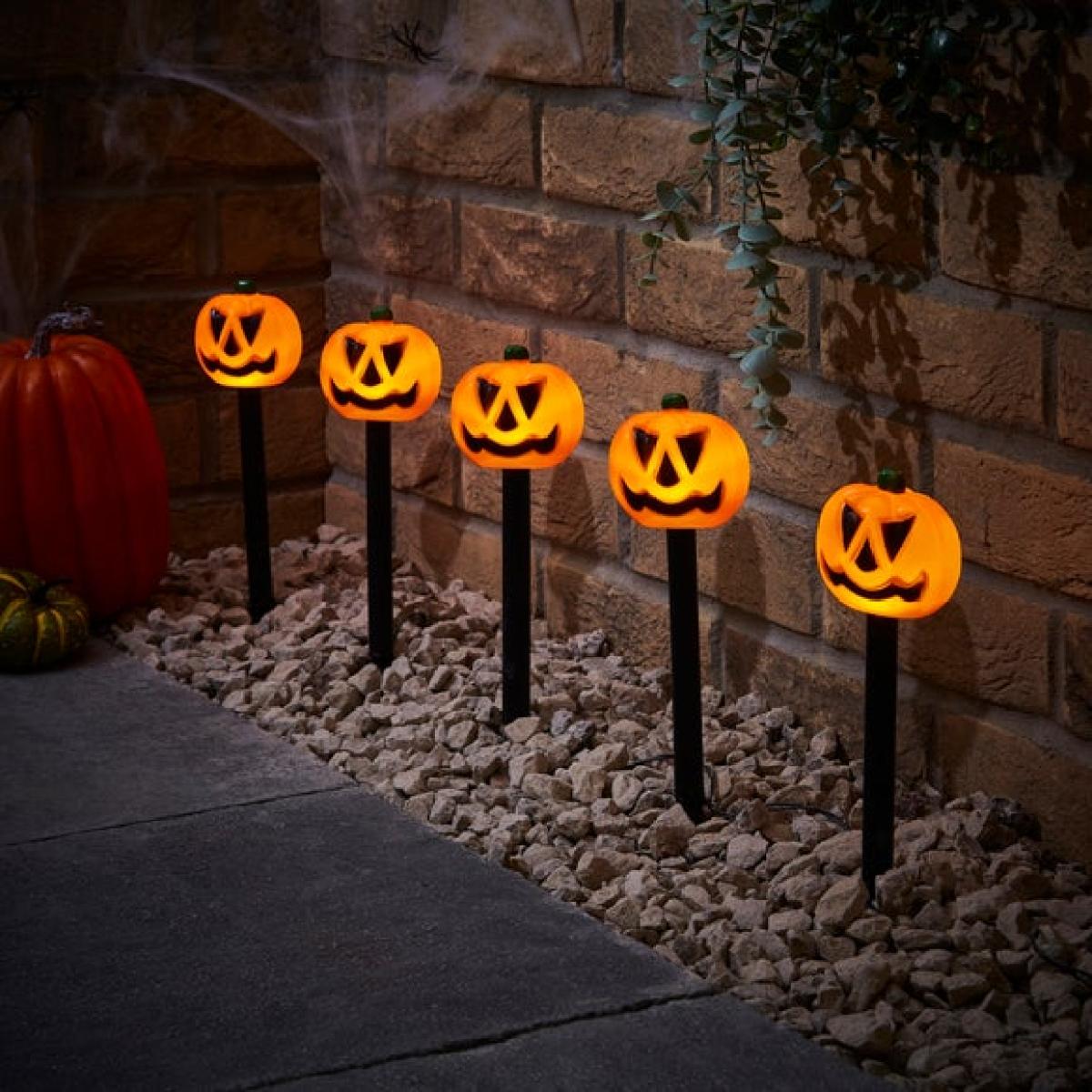 * Set of 5 pumpkin-shaped stake lights * Static light function * Built-in timer (6 hours on, 18 hours off) Add a warm glow to your Halloween display with this set of five pumpkin stake lights. Designed for both indoor and outdoor use, they’re a fun way to light up paths, porches or party corners. The static light setting keeps things steady while the built-in timer handles the rest, switching on for six hours and off for eighteen. Please Note: In accordance to The Offensive Weapons Act 2019, this product is now click and collect only. You may be asked to show ID upon collection.