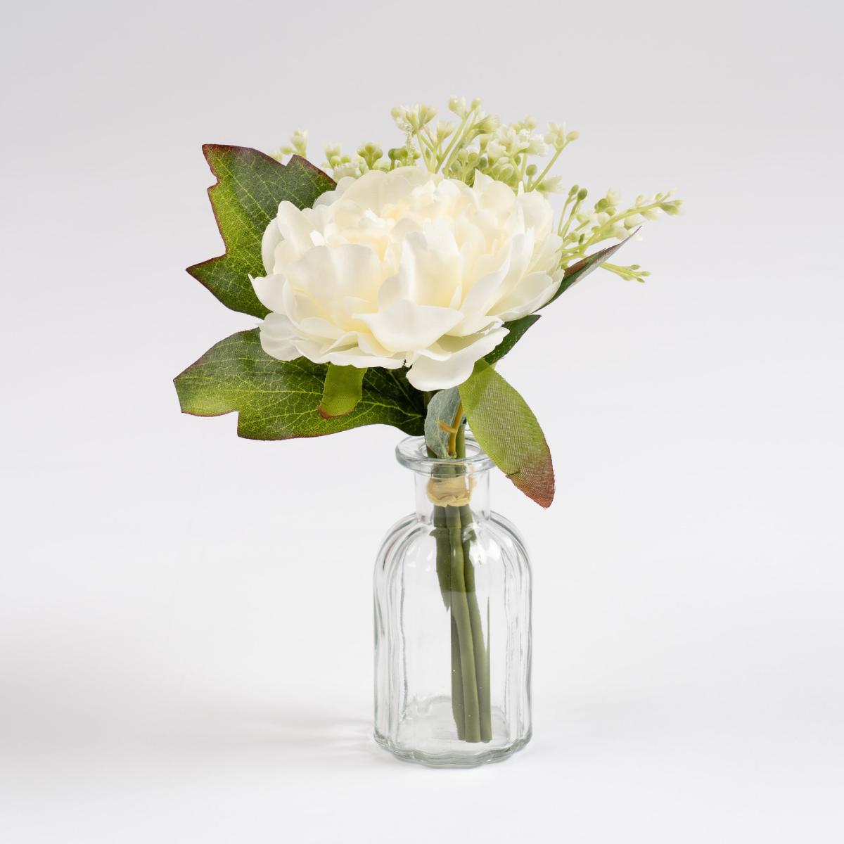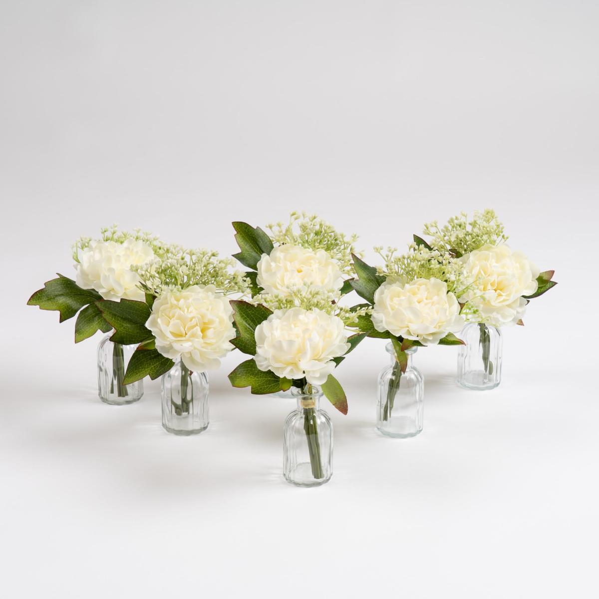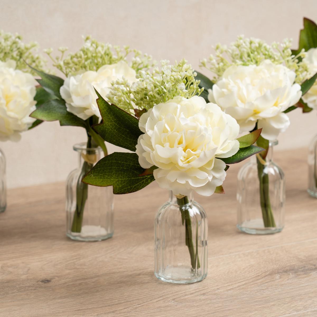 * Set of 6 * Artificial posies * Fresh white blooms * Ribbed glass vases included Bring timeless elegance to any setting with this set of 6 artificial peony and gypsophila posies in mini ribbed glass vases. Carefully designed to add a sophisticated touch, they’re the perfect size for shelves, desks or windowsills, enhancing your space without overwhelming it. Whether for your home, office, wedding or special event, these posies bring subtle beauty to any occasion. They also make a lovely gift or can be dressed up with hessian ribbon for a charming rustic twist.