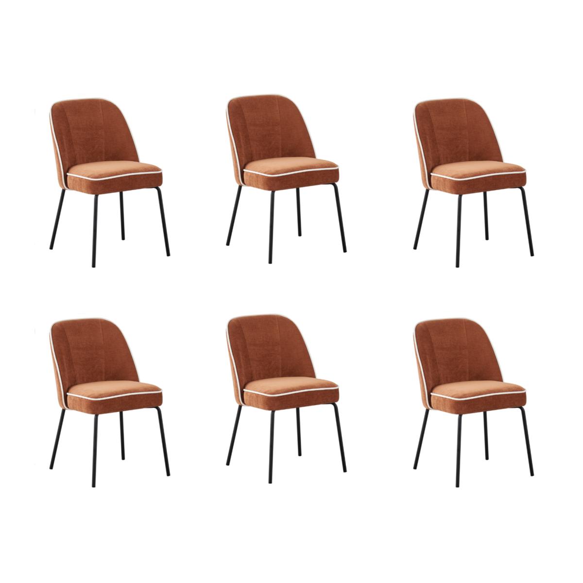 The Celia Dining Chairs effortlessly blend contemporary style with everyday comfort, making them a standout addition to any dining space. Wrapped in plush rust chenille fabric, these chairs offer a soft and inviting texture, enhanced by contrasting cream piped edges for a sophisticated finish. Featuring a sprung seat and gently curved backrest, these chairs provide superior support and cushioning, ensuring lasting comfort during meals and gatherings. The slim black metal legs create a modern silhouette, while offering durability and stability for everyday use. Designed to complement a variety of dining tables and interior styles, from minimalist and Scandinavian to industrial and contemporary décor. Enhance your dining experience with this set of 6 Celia dining chairs, designed to blend comfort with contemporary style. Upholstered in soft rust chenille fabric, these chairs feature contrast cream piped edge detailing that enhances their stylish appeal. The sleek black metal legs add a contemporary touch, while the sprung seat provides exceptional comfort, making them perfect for hosting dinner parties. Designed with a gently curved back for added support, these chairs provide both style and functionality. The rich rust colour brings warmth and a modern vibe to any dining space, making these chairs a perfect addition to any home.
