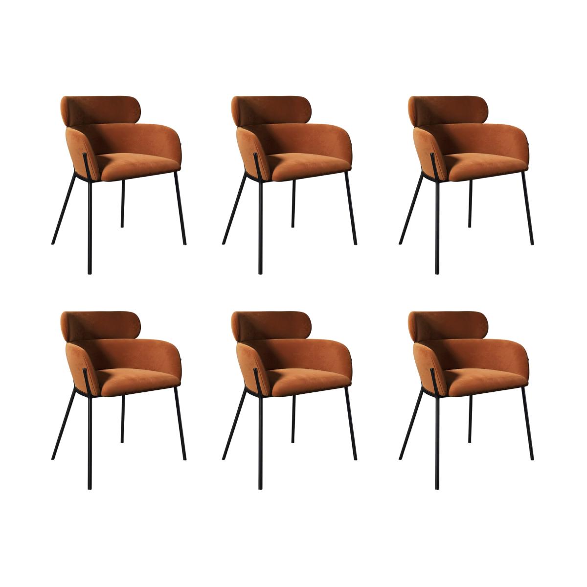 The deep burnt orange velvet adds warmth and character, offering a soft, durable, and easy-to-maintain finish. Upholstered in soft, high-quality velvet made from recycled plastic bottles, these chairs offer a luxurious feel with an eco-conscious edge, helping to reduce environmental impact. A curved backrest and padded armrests provide excellent support, ensuring comfort for long meals or extended seating. The black powder-coated frame ensures stability and durability, while the exposed metal back adds a modern, stylish touch. Crafted with eco-conscious materials, these chairs combine high-end design with environmentally responsible production. The Isla Set of 6 Dining Chairs is designed for those who appreciate both elegance and sustainability. Upholstered in recycled velvet made from plastic bottles, these chairs allow you to furnish your space responsibly without compromising on style or comfort. The soft, high-quality fabric provides a plush seating experience, while the warm burnt orange hue adds a refined yet inviting touch. The padded back and arms provide support, whilst the durable metal frame ensure long lasting use. Perfect for those who appreciate both elegance and functionality, the Isla dining chairs will transform your interiors, making every meal or gathering a stylish and comfortable experience.