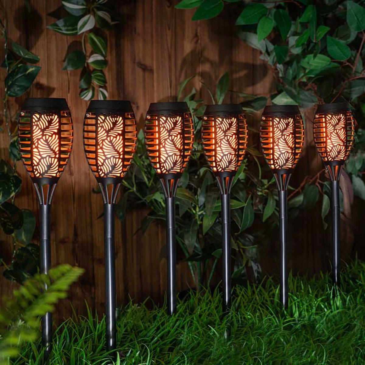 I really like this set of six flame solar stakes for adding ambient lighting to outdoor spaces. Their sleek black design makes them versatile enough to work with various garden styles, from modern to rustic. They’re perfect for lining paths, garden beds, or creating cosy nooks. I’d recommend placing them at varying distances along a walkway or around seating areas to create a warm, inviting glow without overwhelming the space. Their solar-powered feature means no fuss with wiring, making them both practical and stylish-ideal for anyone looking to enhance their outdoor look effortlessly.