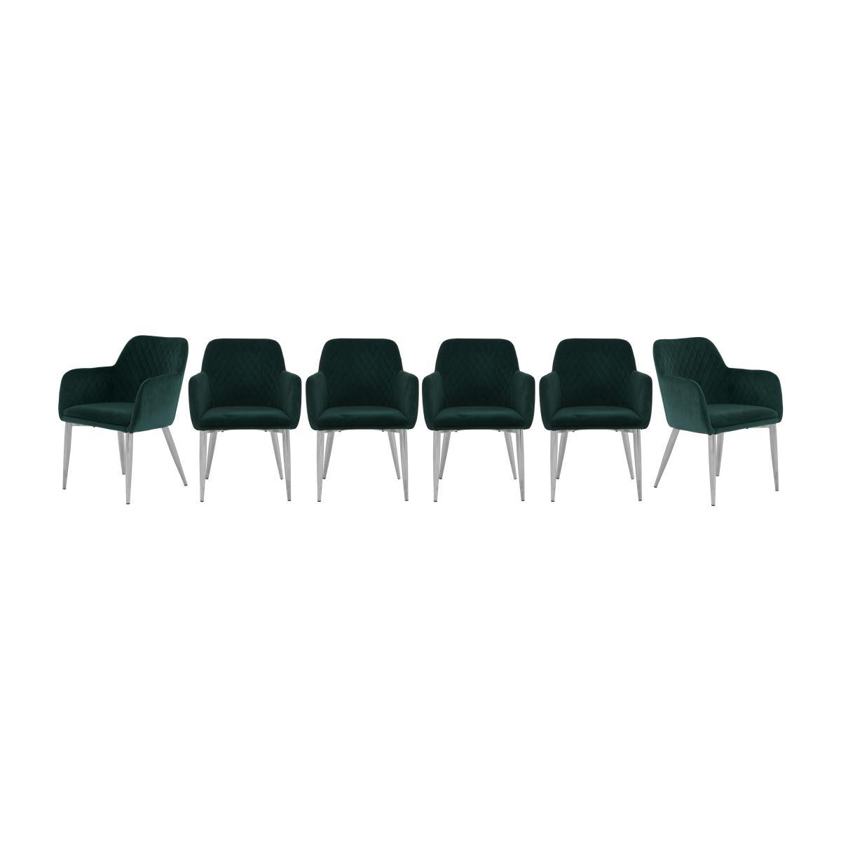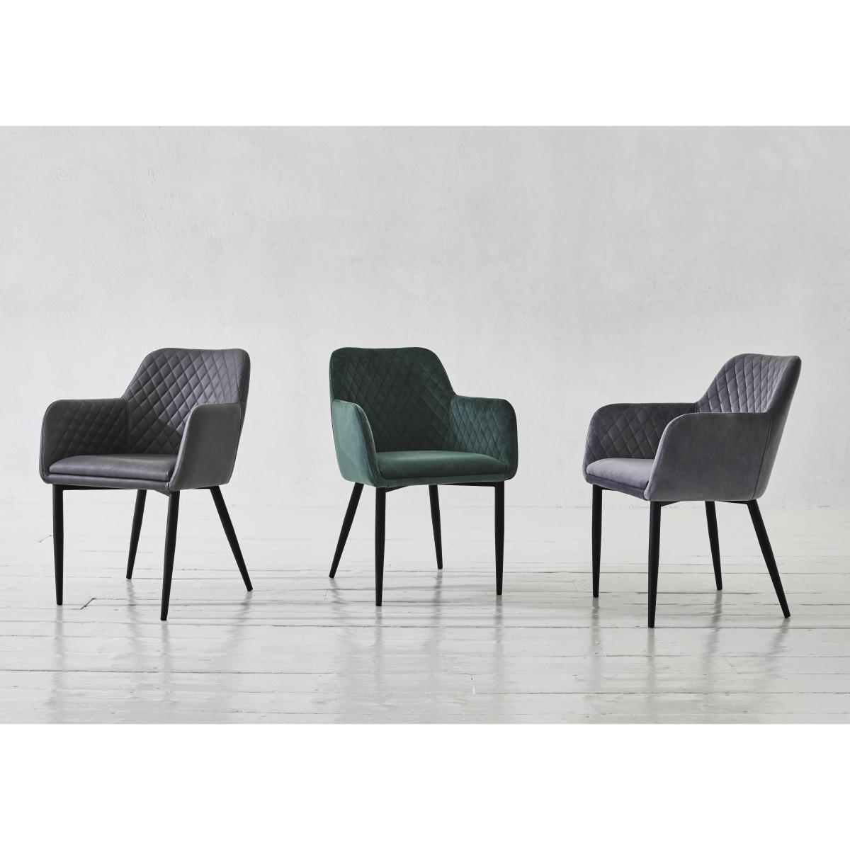 Set of six chic retro-modern dining chairs in faux leather or velvet. The chair backs curve into slim, shaped arms. With quilting detailing, in a choice of three fashionable colours. Why you’ll love it. Chic, retro-modern curves with Deco appeal. Quilted inside the backs and arms. Soft velvet also available in sleek faux leather upholstery too. In contemporary grey, granite or dark green. Exquisitely tailored, softly cushioned. Polished chrome or matt black metal legs. The chairs coordinate perfectly with the Olympia round tables. What you need to know. The black or chrome finish legs are made of strong steel. Cushioned seats and backs are foam-filled. Flattening and shading of heavy wear areas on velvet is unavoidable. Pile fabrics may be vacuumed lightly using the curtain attachment. Brush regularly in the direction of the pile with a soft brush.