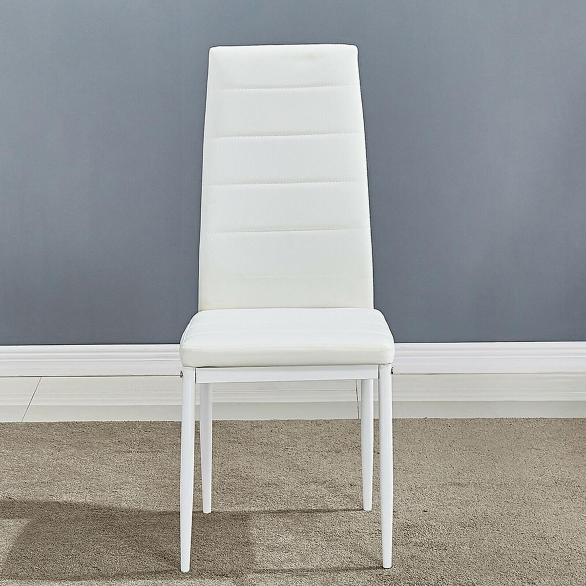 White Faux Leather Chairs For Kitchen, Dining. Comfy chairs soft pad with the finest faux leather with detailed stitch craft. The chairs seats and backrest are extra padded cushioned for extra comfort when you sit on. The chairs come with protection caps to protect the floor. Solid Metal Frame Dining Chairs: steel frame constructed for great stability and durability. The item comes flat packed and requires some home assembly. All tools and fittings are included.
