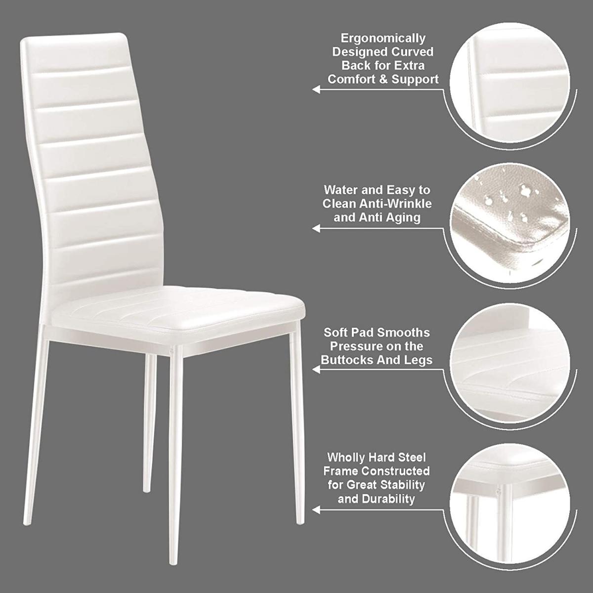 White Faux Leather Chairs For Kitchen, Dining. Comfy chairs soft pad with the finest faux leather with detailed stitch craft. The chairs seats and backrest are extra padded cushioned for extra comfort when you sit on. The chairs come with protection caps to protect the floor. Solid Metal Frame Dining Chairs: steel frame constructed for great stability and durability. The item comes flat packed and requires some home assembly. All tools and fittings are included.