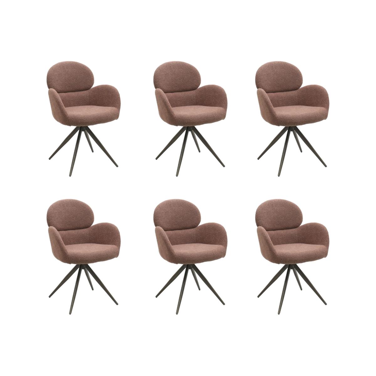 Enjoy ultimate flexibility and convenience with a full 360-degree swivel feature, perfect for dynamic seating options in dining or living spaces. The soft boucle fabric in a warm rust tone adds a touch of retro elegance while being cosy and inviting. The curved, cocoon-like backrest creates a unique silhouette, blending vintage charm with contemporary style. Sleek bronze-finished legs complement the rust boucle fabric, adding a sophisticated contrast and stability. Designed for larger households or entertaining, these set of four dining chairs combines comfort, durability, and a modern style, perfect for family meals or hosting guests. Introduce a retro flair to your home with these Rust Boucle Swivel Dining Chairs. Upholstered in plush rust boucle fabric, these chairs offer both comfort and style. The cocoon-like curved backrest provides a cosy seating experience, while the 360-degree swivel feature ensures versatility for dining, working, or relaxing. Supported by elegant bronze-finished legs, these chairs combine practicality with timeless design. Ideal as a set of six, they make a stunning addition to any dining table, kitchen, or even as statement pieces in your living space.