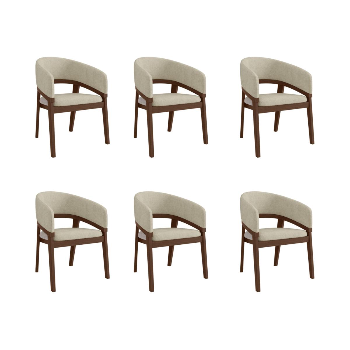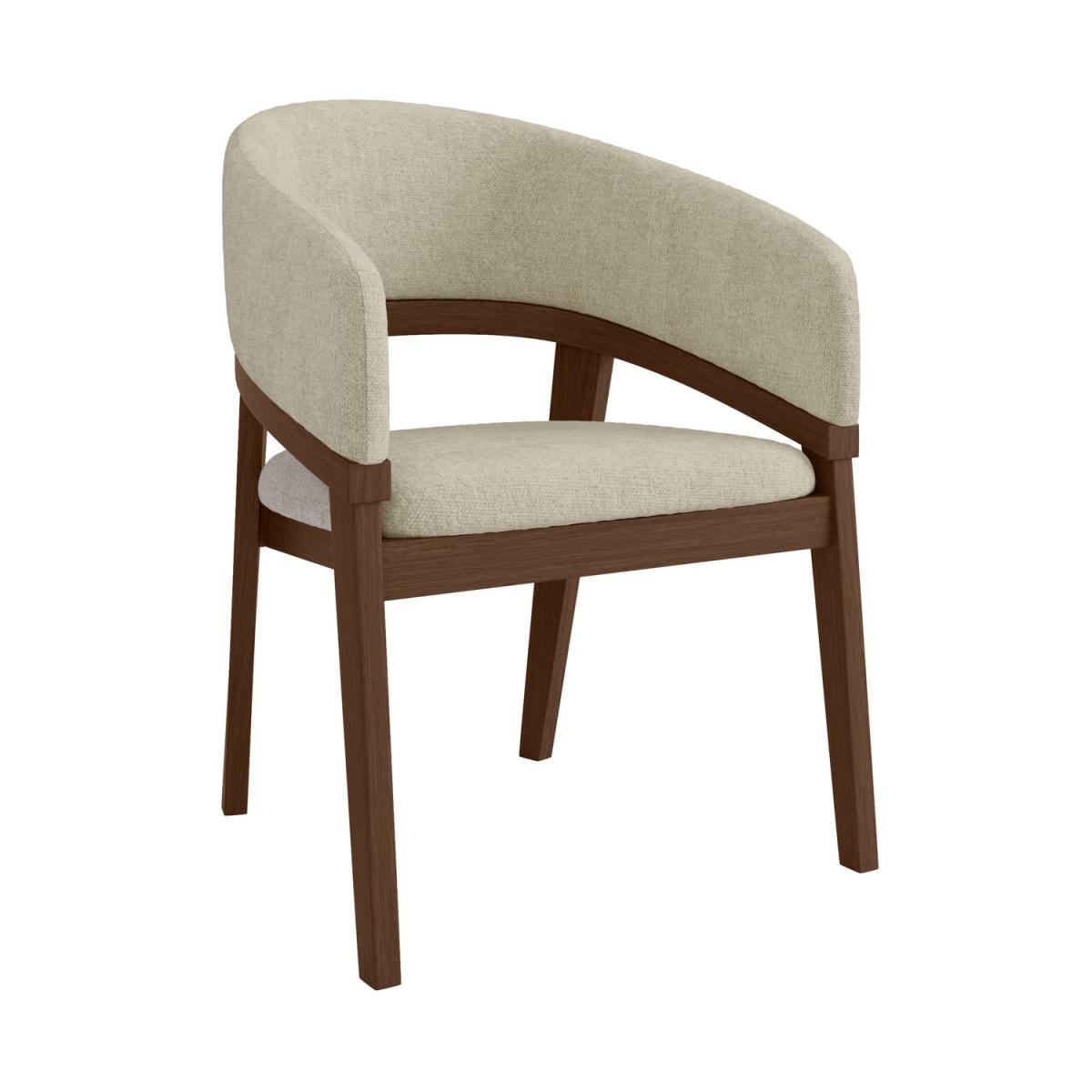 A curved backrest and armrests with a stylish cut-out detail create a sophisticated look. Solid wood construction ensures durability while adding warmth to your space. The beige fabric upholstery provides a soft, inviting seat for dining or relaxing. The curved backrest offers excellent support, perfect for extended seating. Upgrade your dining space with these curved dining chairs. Featuring an elegant cut-out and curved backrest design, these chairs blend modern sophistication with everyday comfort. The plush beige fabric upholstery and padded back and armrests are perfect for long dinners or casual gatherings. Built for durability, the solid wood frame with a walnut-stained finish adds warmth and stability, making these chairs a long-lasting addition to your home.