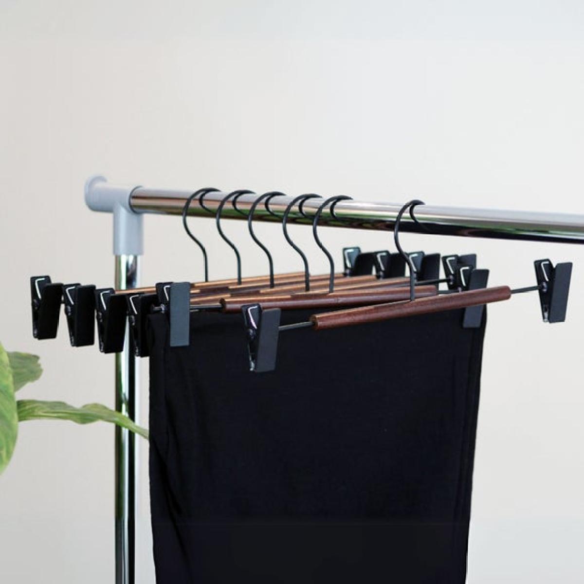 * Set of 6 * Holds multiple pairs of trousers * Firm clips help prevent slipping * Swivel hook for easy hanging * Helps reduce creasing The Set of 6 Wooden Bar Clip Trouser Hangers are made to help free up space and keep trousers neatly in place. Each hanger holds multiple pairs, with strong clips that grip without leaving marks. A swivel hook adds flexibility, making it easier to hang items in different directions. Simple and practical, they’re a tidy solution for any wardrobe.
