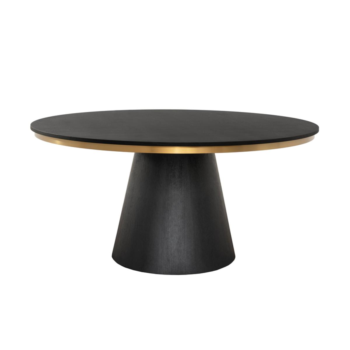 Spacious table with solid ash base and ash veneer top, finished with matt black lacquer and brushed brass ring detail. Comfortable sprung and padded chairs upholstered in a luxurious, chunky, woven polyester fabric. Assembly of the table is required.