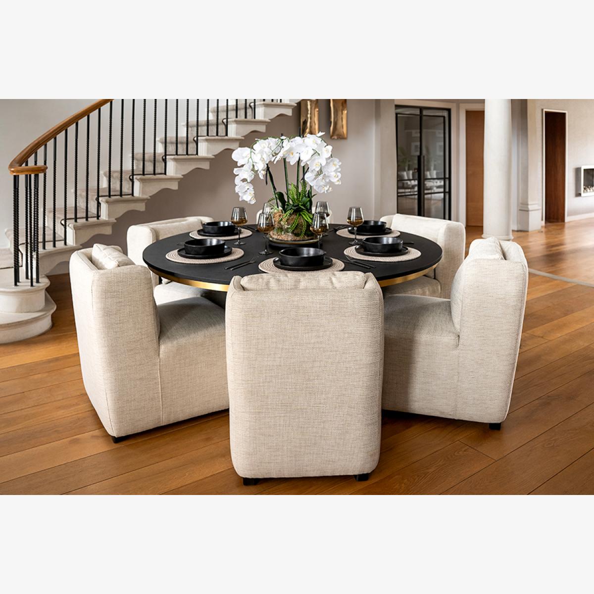 This set of the Brewster table and Quadria chairs offers a versatile and contemporary look that works well in both modern and transitional interiors. I love how the round table creates an inviting atmosphere, perfect for family meals or entertaining friends. The neutral upholstery of the chairs provides flexibility for styling with different colour schemes and accessories, such as colourful placemats, runners, or statement centrepieces. To keep the look balanced, I recommend pairing it with warm-toned wood flooring or subtle metallic accents for added sophistication. Practical tips include using the chairs' ample cushioning to add cosy throws or cushions for extra comfort, and considering a table runner to soften the space while highlighting the table surface. Overall, it’s a stylish, functional choice that adapts easily to various interior styles.