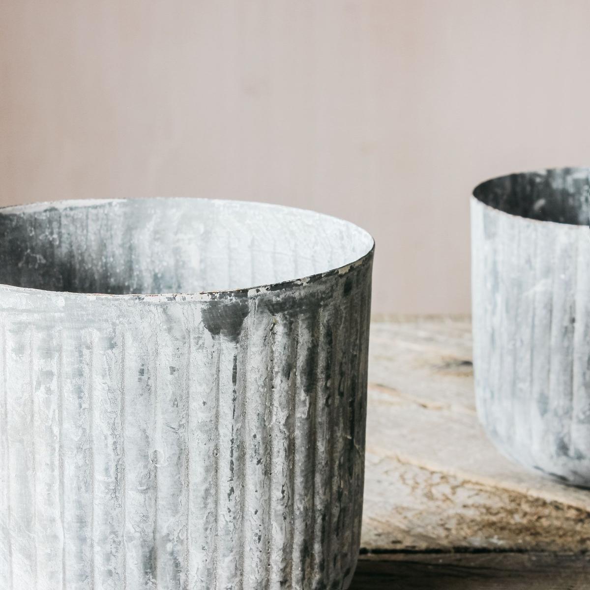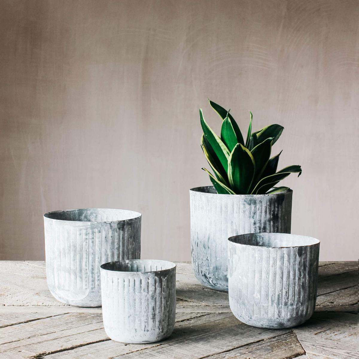 A set of four planters featuring a round silhouette and made of galvanized iron that will develop a natural patina over time so that each will be unique.