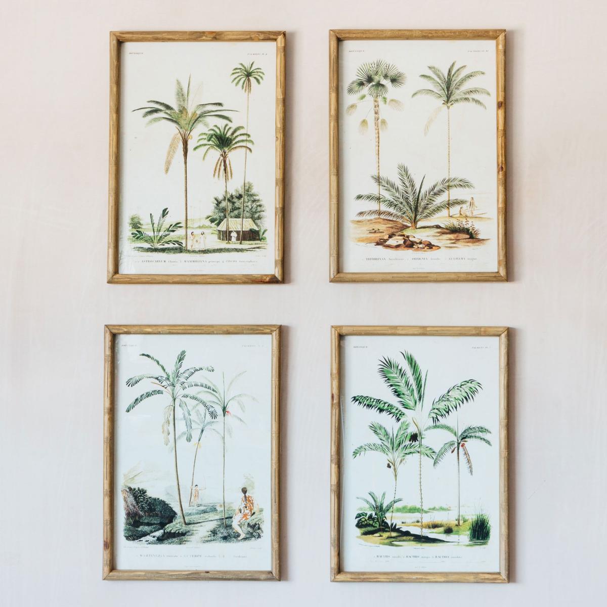A set of vintage-inspired botanical prints exploring four tropical palm trees in their natural habitat each with an unusual bamboo frame surrounding it, perfect for adventurers and naturalists alike.