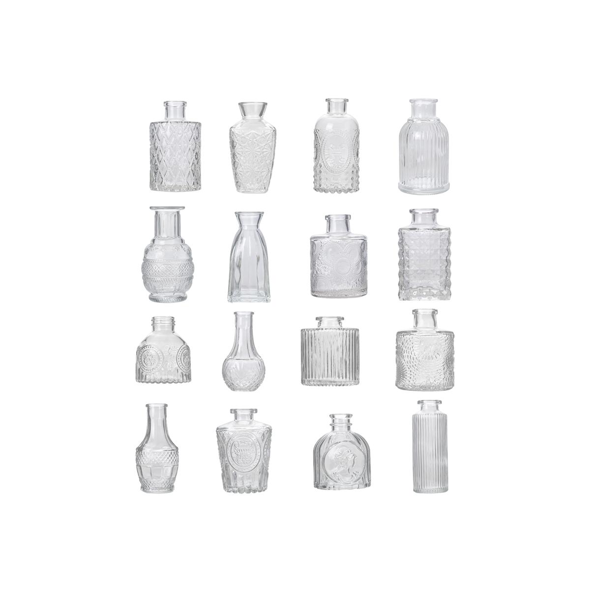Display a single stem or create petite arrangements with this set of clear glass bud vases. From cylindrical and hourglass to bottle shapes, each vase radiates elegance. Embossed and pressed patterns lend character, from geometric motifs and vertical ribs to grid designs. Perfect for small posies, displays or as stand-alone ornaments, they complement Scandinavian, French, Japanese and vintage settings.