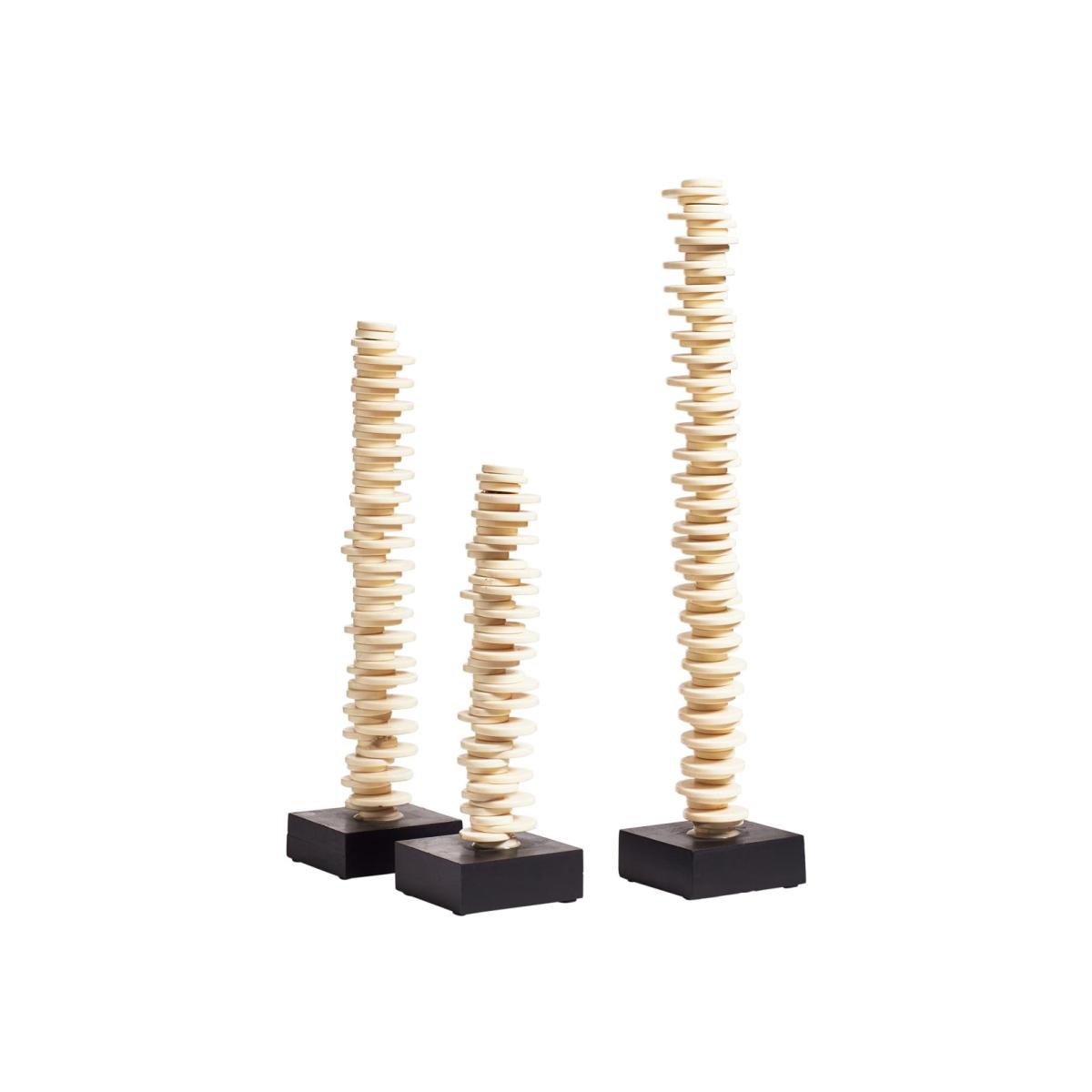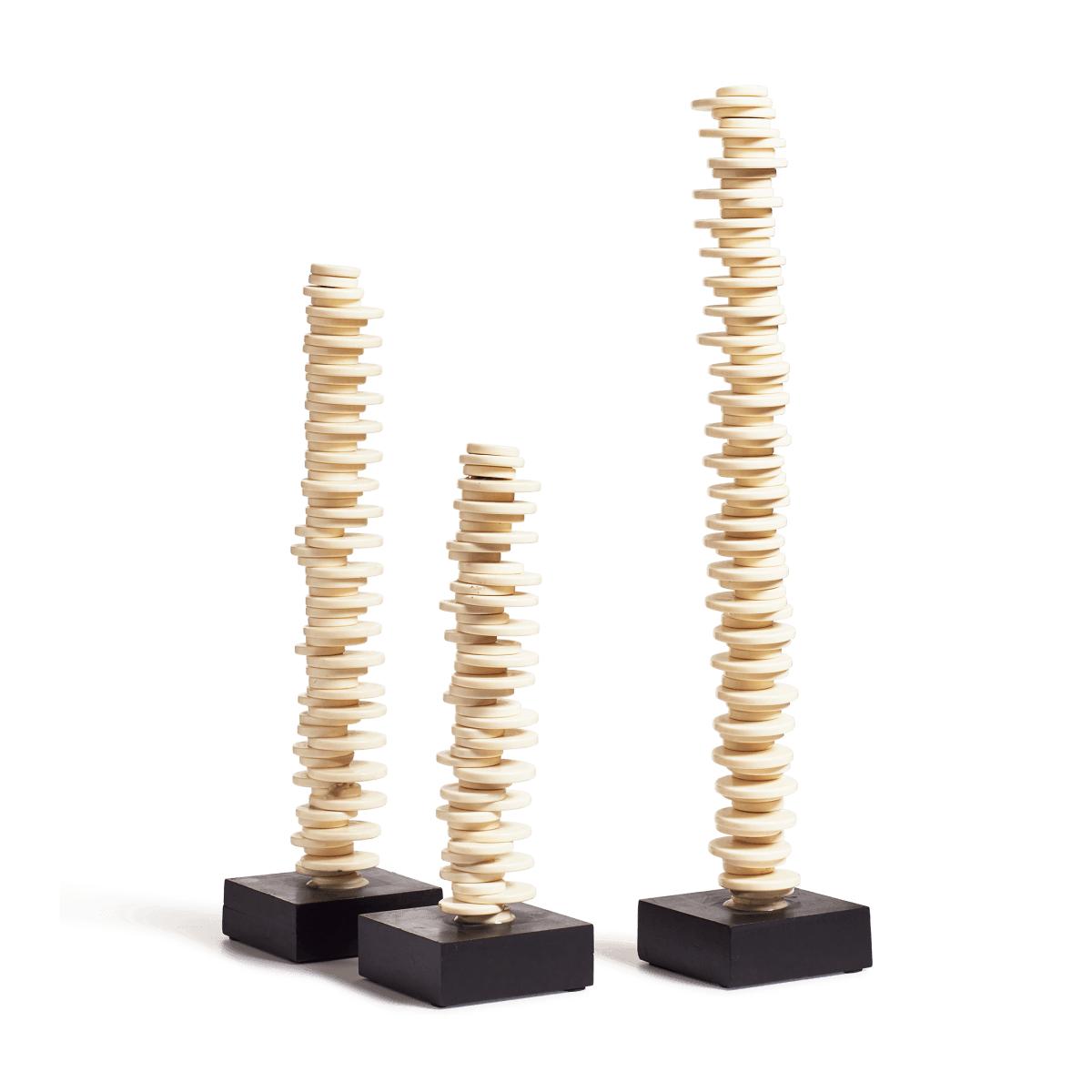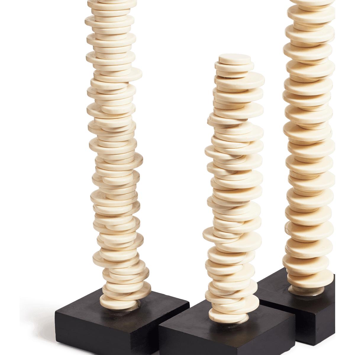 Our Set of Three Cairn Pebble Ornaments take inspiration from the manmade stacks of stones often found as markers or monuments on hiking trails. Standing on black wooden platforms, they have a pleasingly irregular appearance thanks to the way they are constructed and their differing heights.